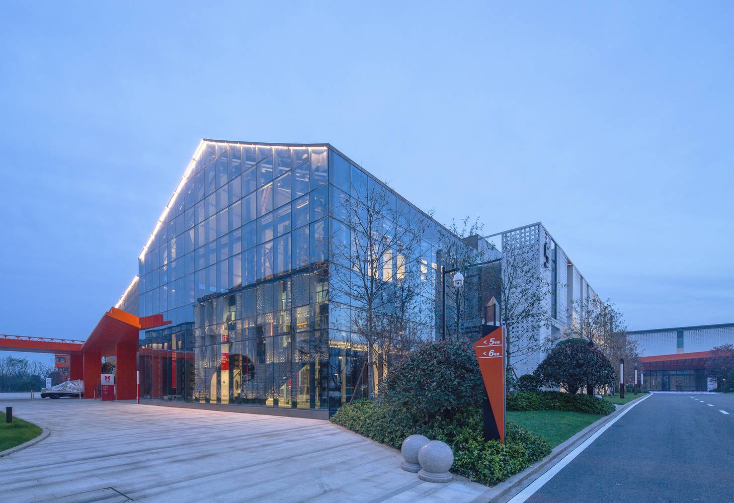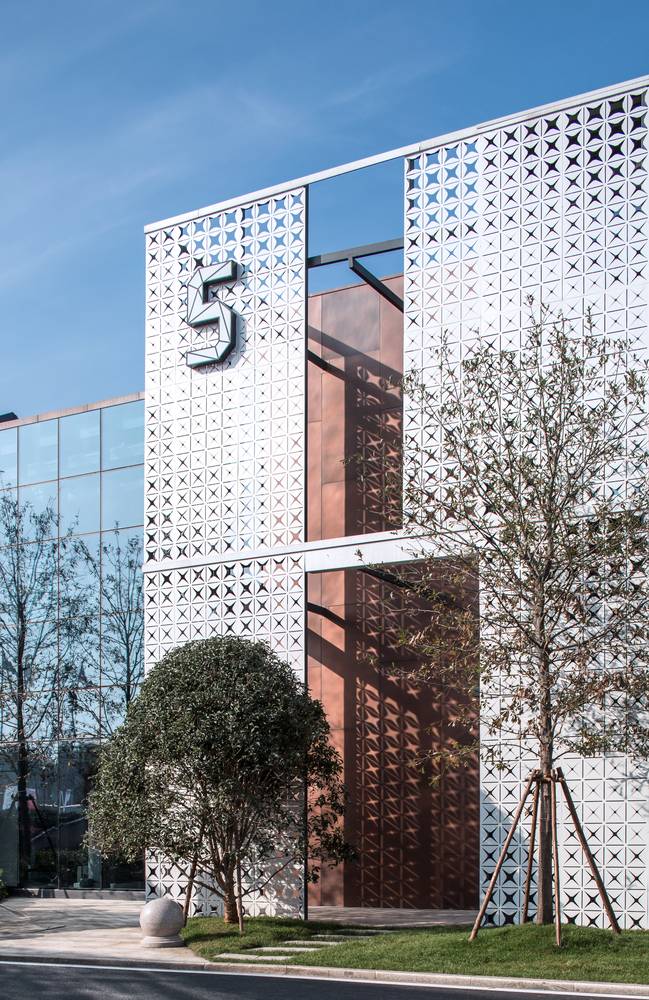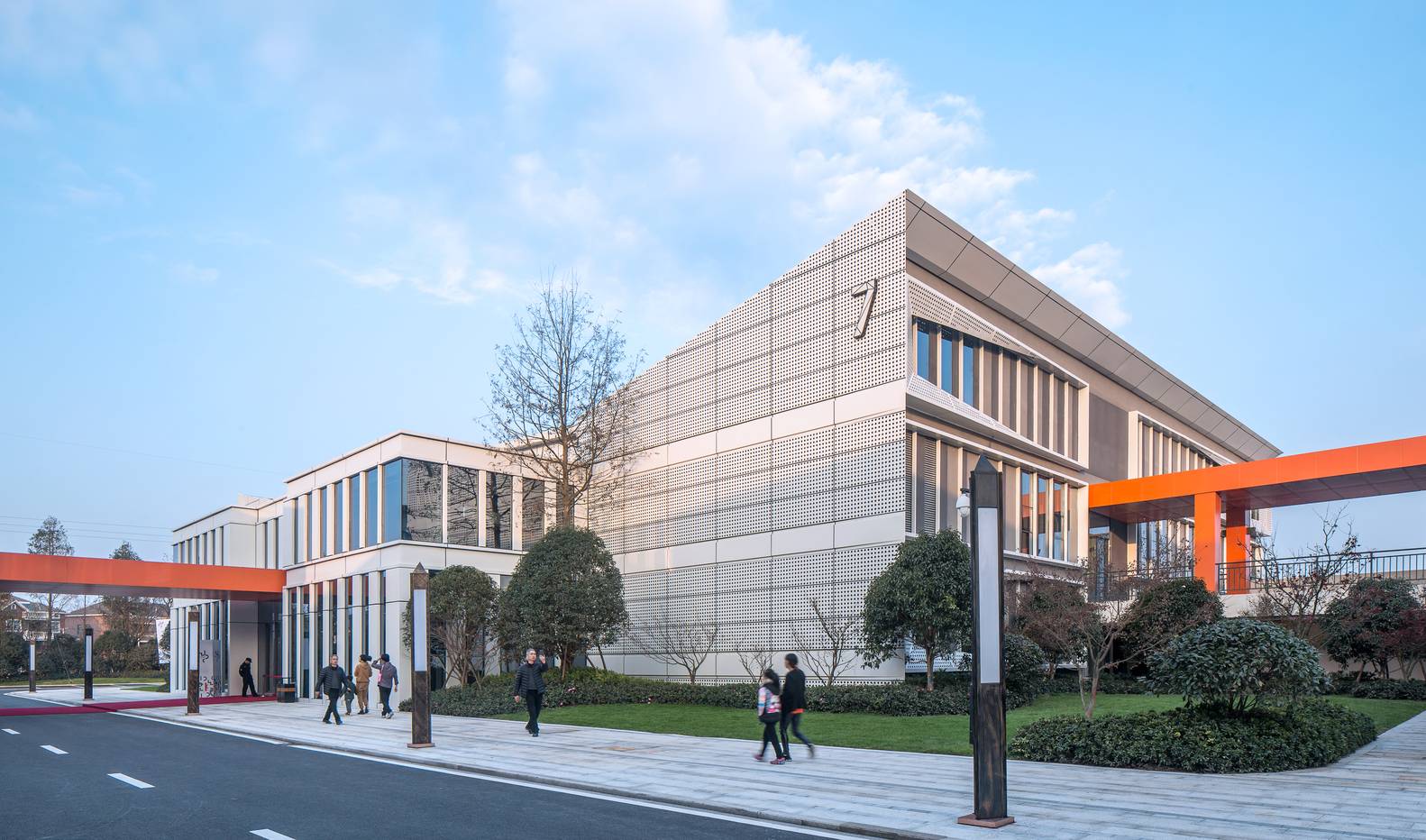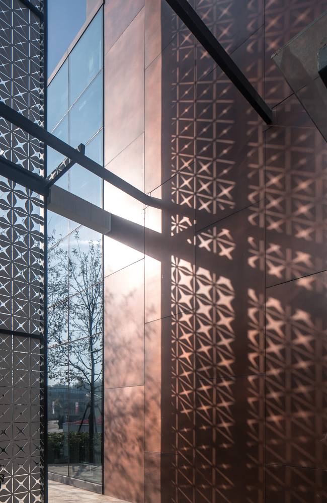 不同于原有廠房所訴求工業(yè)屬性的遺存,新建廠房的創(chuàng)造更注重尋求形意的表達。衍變自良渚文化的典型器物玉琮,取自其橫向線條和轉折關系,解構重建賦予立面,起到不同的遮陽作用。同時,用粗細變化的彩釉玻璃,營造建筑立面的光澤變化,表現(xiàn)建筑如玉般細膩的質(zhì)感,展示良渚古老的文化歷史。