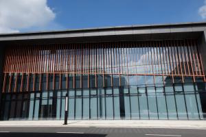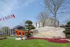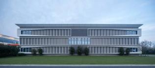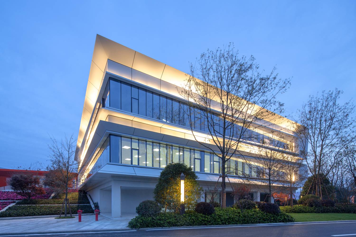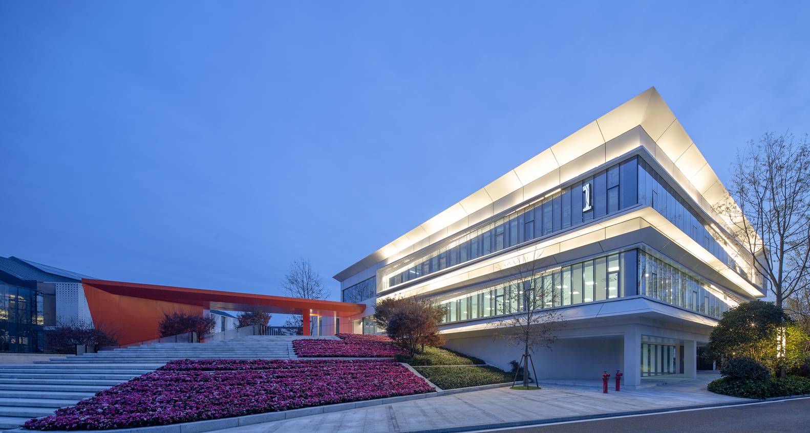 不同于原有廠房所訴求工業(yè)屬性的遺存,新建廠房的創(chuàng)造更注重尋求形意的表達。衍變自良渚文化的典型器物玉琮,取自其橫向線條和轉折關系,解構重建賦予立面,起到不同的遮陽作用。同時,用粗細變化的彩釉玻璃,營造建筑立面的光澤變化,表現(xiàn)建筑如玉般細膩的質(zhì)感,展示良渚古老的文化歷史。