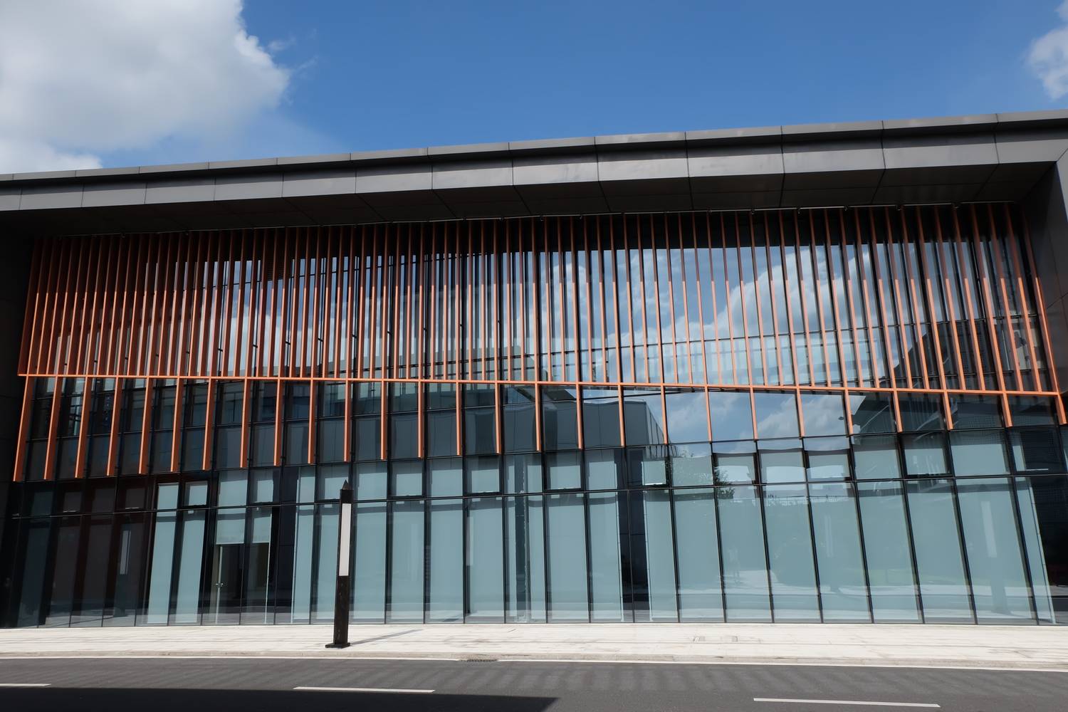 建機場項目隨處可見橙色與純白形成的視覺沖擊,呼應龍門吊的原生色彩。新建外墻面則采用耐候鋼板,以其鐵銹質(zhì)感與歷史貼合。大型辦公建筑外圍立面鋪設鋁合金穿孔板遮陽百葉,現(xiàn)代化的光孔形態(tài)使得立面在不同時段的陽光下都享有豐富的變化。