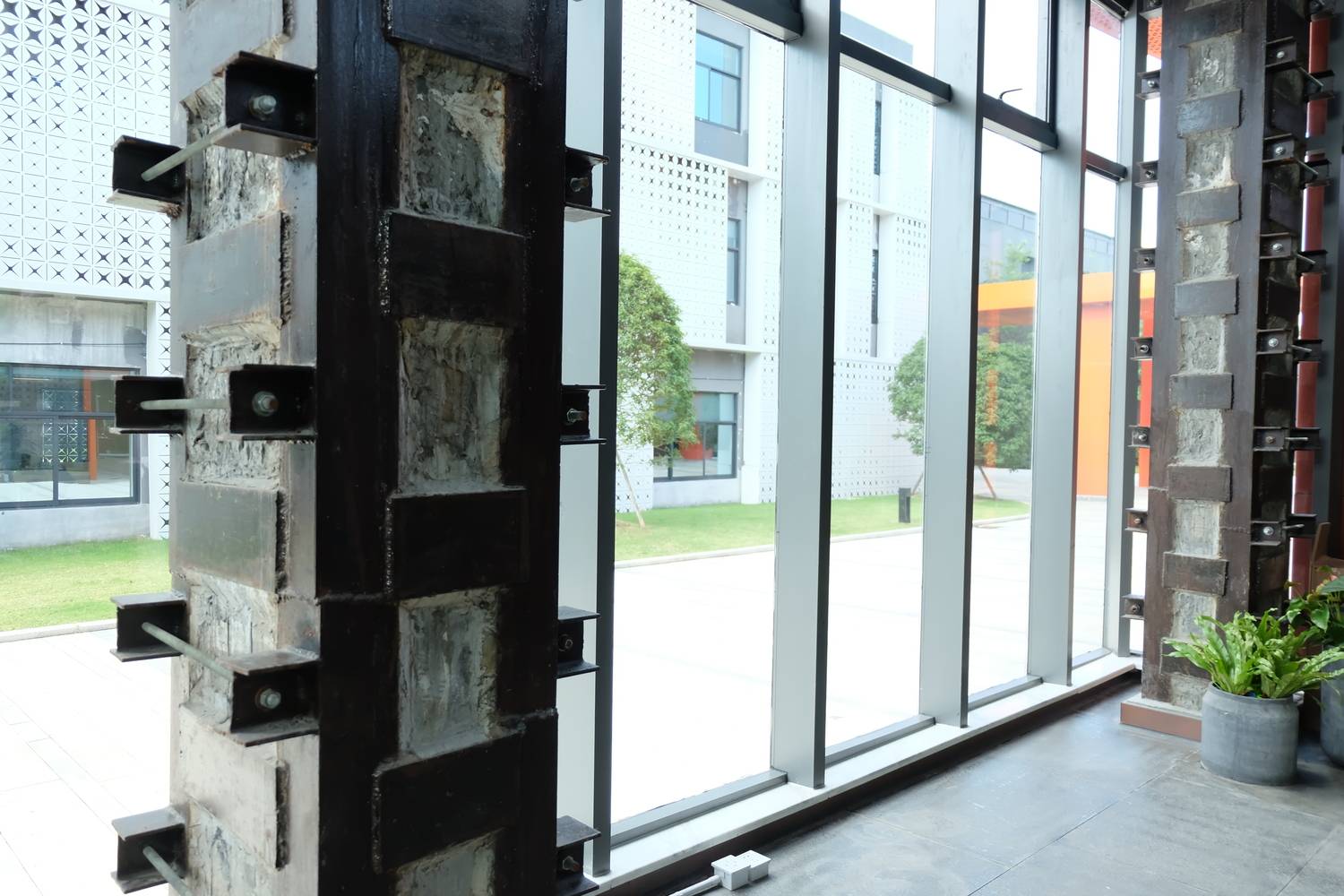 2#樓則被一拆為二,“一半”保留原有建筑,另一部分保留房屋立柱并進行拆后重建。為了確保建筑的安全并對其立柱及房梁等筋骨進行二度加固。形成開闊的空間形態(tài),滿足展廳、水泵用房等基本需求。