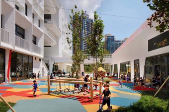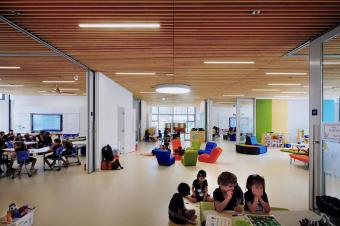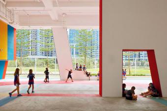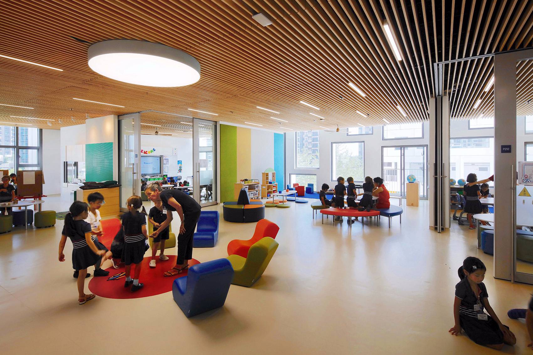 “我們放棄了傳統(tǒng)的教室模式,以開放的學(xué)習(xí)空間來促進(jìn)創(chuàng)意,鼓勵(lì)師生的合作與交流?!盚enning Larsen香港的設(shè)計(jì)總監(jiān)兼合伙人Claude Godefroy說。在小學(xué)部,傳統(tǒng)的封閉式教室可以合并在一起,化身為大型開放式空間 (Villa),加強(qiáng)班與班之后的互動(dòng);而中間原為走廊的空間形成共用空間 (Agora),讓百多名同齡的學(xué)生可以共同學(xué)習(xí),開展小組活動(dòng),也讓法語班和國(guó)際班的課程可以有更多的交流和協(xié)作,合乎未來的工作環(huán)境和趨勢(shì)。