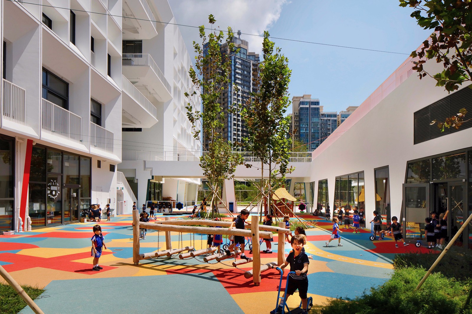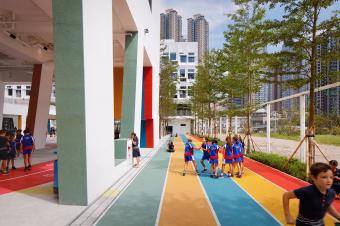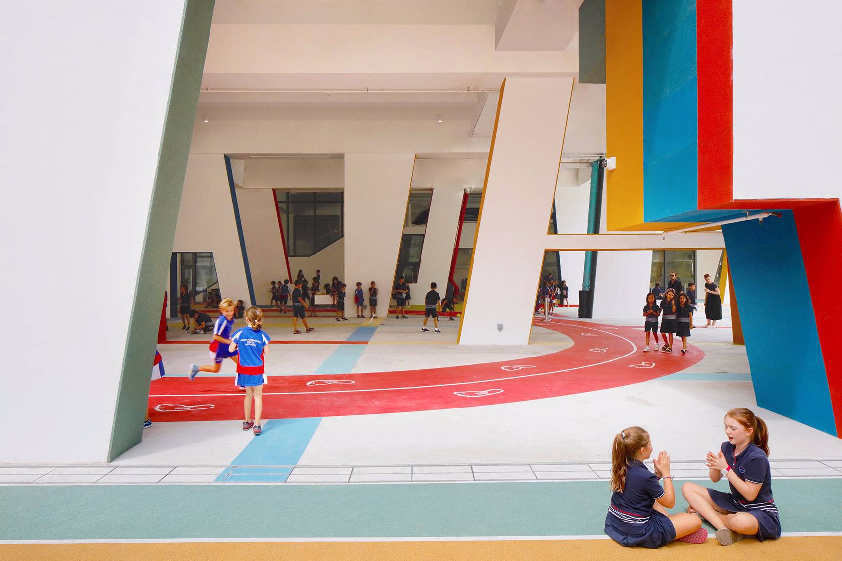 學(xué)校南正門的外立面由627個(gè)彩色瓷磚拼湊而成,五色繽紛的外觀吸引大眾的焦點(diǎn)。當(dāng)陽光隨著一格格的窗戶映入建筑物,為學(xué)校加添色彩。而花園外有一條400米長(zhǎng)、名為 “The Loop”的跑步徑,在整個(gè)校園游樂場(chǎng)和花園中蜿蜒而行,引令來賓走進(jìn)校園,也為學(xué)校加添活力。