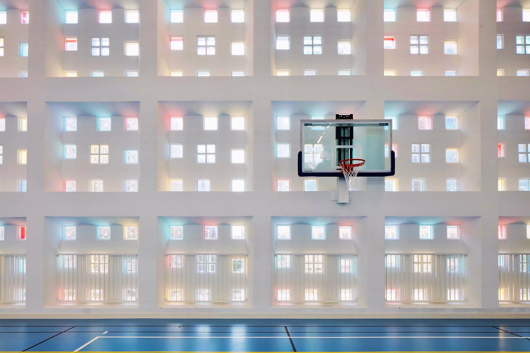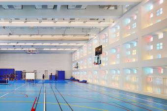 學(xué)校正門的彩色瓷磚除了是獨(dú)特外觀,也象征著學(xué)校支持多元文化的愿景,及其具前瞻性的國(guó)際教育使命。學(xué)校為來自40個(gè)國(guó)家的學(xué)生提供五種語言的教育,是一個(gè)活躍的文化視窗。在課外時(shí)間,安靜的校園為這空間稀缺的城市提供了一個(gè)綠洲。 建筑師特意把教學(xué)空間安置于二層或以上,騰空了首層的空間,令首層的設(shè)施、如展覽區(qū)、飯?zhí)煤陀螛穲?chǎng)、以及體育館和多功能廳可以對(duì)外開放,令學(xué)校在晚上和周末作為促進(jìn)本地與法國(guó)文化交流的理想場(chǎng)所。