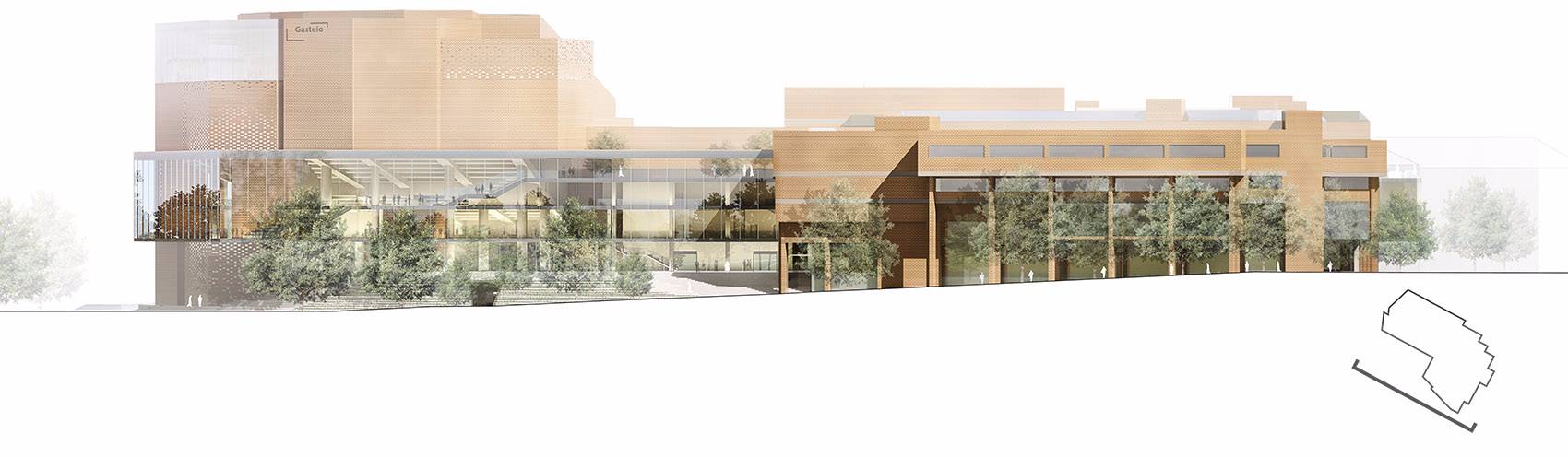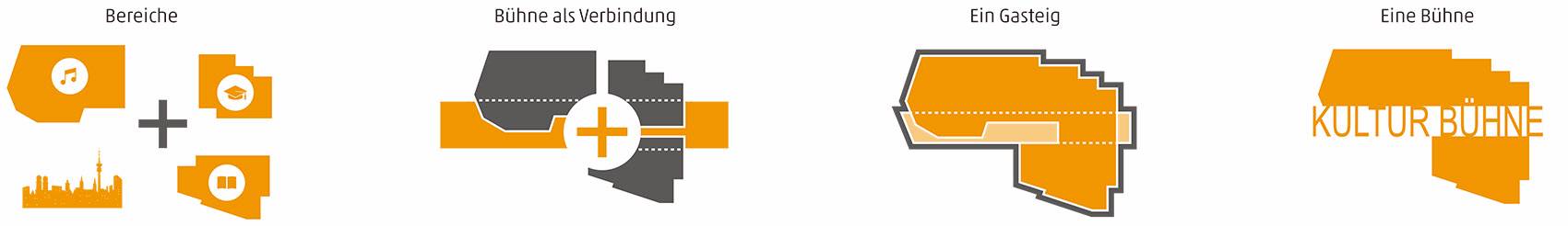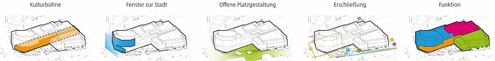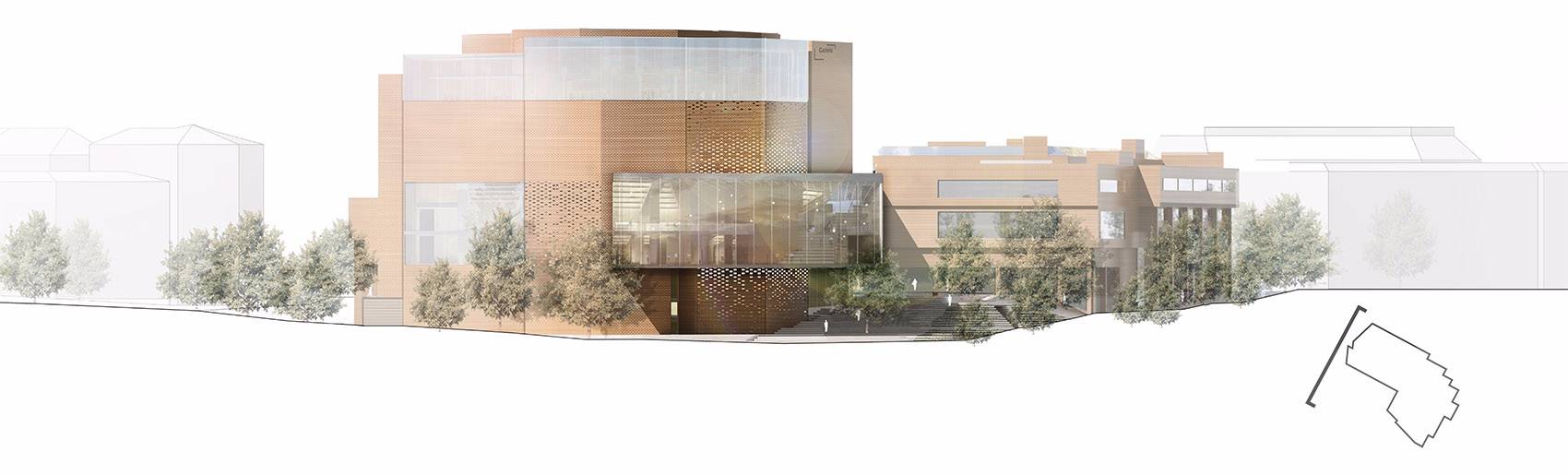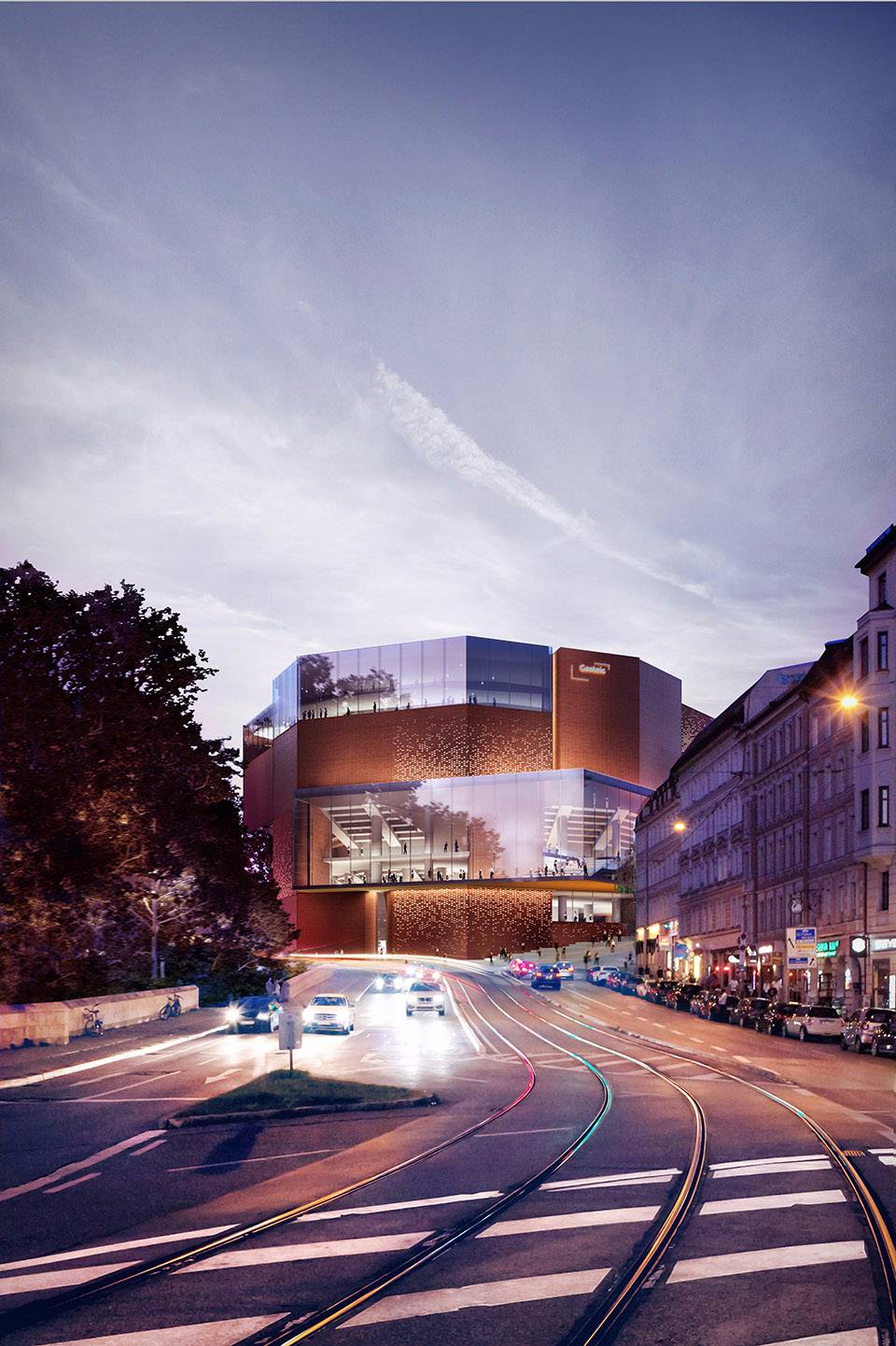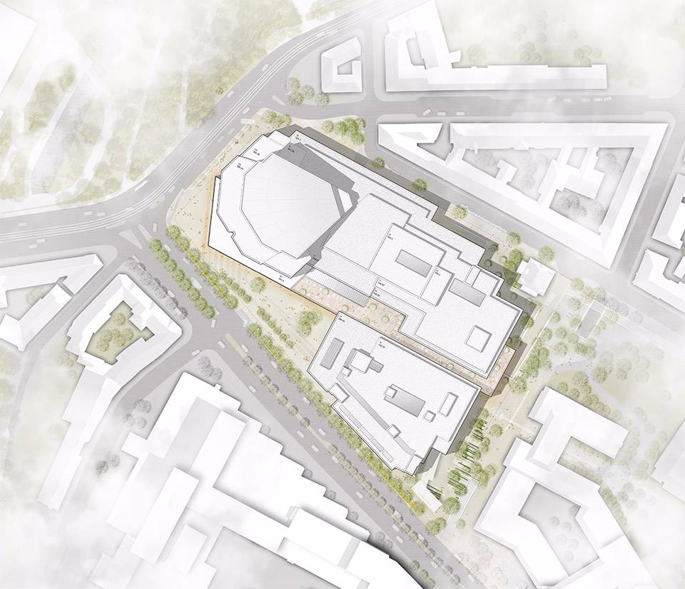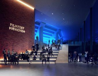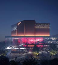 2018年10月24日,慕尼黑音樂廳在集中使用了30年后,開始了修理改造計劃。經(jīng)過了國際競賽和投標,HENN的設(shè)計方案最終獲選。慕尼黑音樂廳是歐洲最大的文化中心,每年要接待大約兩百萬游客。慕尼黑音樂廳最初由Raue, Rollenhagen, Lindemann和Grossmann作為合作伙伴設(shè)計而成,在1984/85年開放。音樂廳的現(xiàn)代化和廣泛的文化活動令慕尼黑有了一棟全球獨一無二的建筑。新設(shè)計中加入了一個新的建筑元素:玻璃棧橋,用來連接建筑已有部分和新的玻璃幕墻區(qū)域,玻璃幕墻令過路的行人可以看到音樂廳內(nèi)部充滿活力的景象,并歡迎游客和職員成為城市文化生活的一份子。這個“Kulturbühne”(文化舞臺)同時作為新音樂廳的主要象征,另外,從設(shè)計方面看,透明、開放的玻璃幕墻和原有建筑類似于龐大石頭的體塊形成對比。為了實現(xiàn)“一個”(“ONE”)音樂廳的設(shè)想,新的文化舞臺在水平和垂直方向都有所延伸,來保持音樂廳各部分空間上的連續(xù)性。文化舞臺同時可以作為交通節(jié)點、前廳、展覽和活動空間使用。它為游客和員工提供了清晰的視野,同時還作為建筑各個功能之間的連接路徑。除去使用功能外,文化舞臺的每個元素都有它的定位和特征,無論是交響樂演奏廳(Philharmonic)、卡爾奧爾夫禮堂(Carl Orff Auditorium)、圖書館還是慕尼黑Volkshochschule(繼續(xù)教育中心——MVHS)。從城市規(guī)劃角度來看,引人入勝的臺階抵消了音樂廳原先孤立的感覺,使音樂廳與“gache Steig”(從Isar河到新音樂廳的上坡)形成了更合理自然的連接。