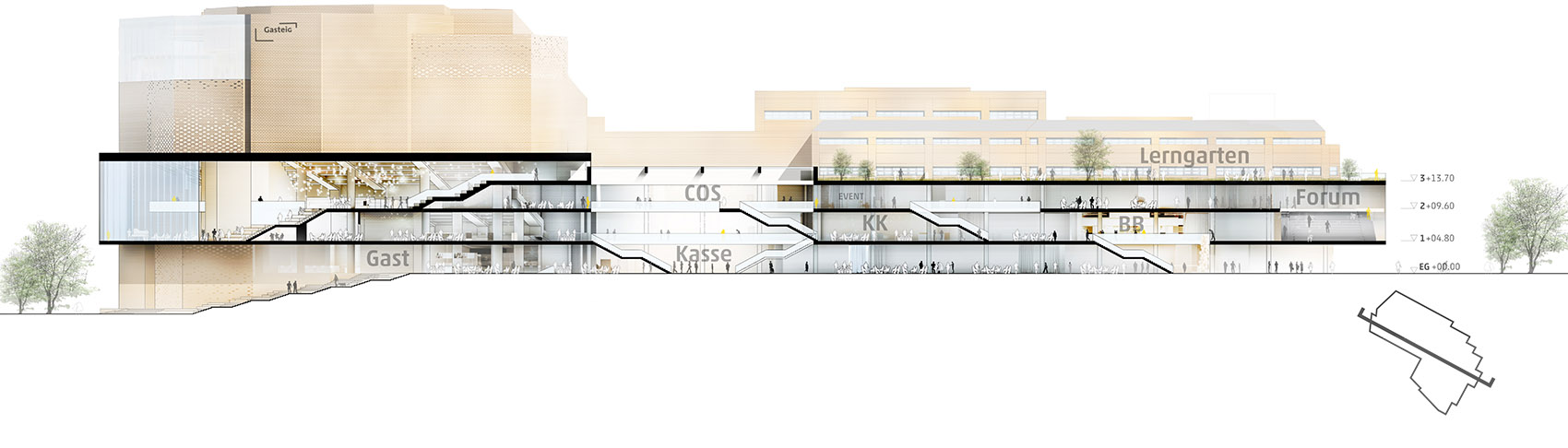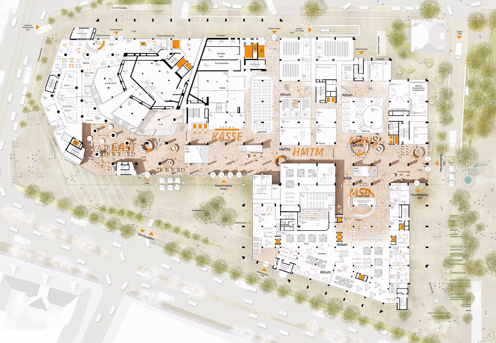 慕尼黑Volkshochschule (繼續(xù)教育中心 – MVHS)有獨立的位置,包括一層的信息咨詢處,還有文化舞臺從東到西的通路上,無論從哪個入口進入建筑都可以馬上看到。MVHS由它的子中心運營,同時構(gòu)成清晰的定位系統(tǒng),所有的學(xué)費室配備了最現(xiàn)代的數(shù)字設(shè)備??臻g的多樣、流線的布局為音樂與表演藝術(shù)大學(xué)(University of Music and Performing Arts)和文化提升服務(wù)提供了交叉協(xié)同作用。兩個寬敞的中庭為學(xué)費室和工作區(qū)提供了充足的日照。