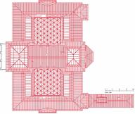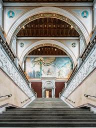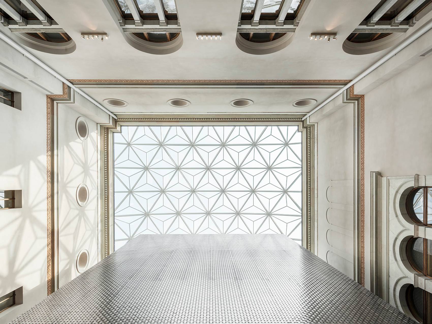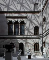 兩個中庭采光都依靠上方的玻璃屋頂,玻璃屋頂很薄,這樣就不會影響建筑物的外輪廓。但是拱形屋頂有一點不足之處,即會使聲波聚集在空間中心處。玻璃屋頂是由一個個小的錐形結構組成的,這是為了給中庭提供盡可能好的聲效。這樣的話,聲波可以分散至周圍的墻壁上,墻壁的吸聲灰泥飾面能夠吸收聲波,地面上的混響就不存在了。如此一來,兩個中庭都可以用來舉辦各種公共活動。墻面的灰色可以讓光線更加柔和,這對周圍的畫廊空間也是有好處的。