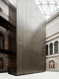 我們面臨的第一個挑戰(zhàn)是如何解決流線問題。游客和藝術品都有各自的新的交通流線。博物館負一層之前里面全是管道和布線,現(xiàn)在通過降低層高來騰出空間布置洗手間和寄存處?;ゲ唤徊娴膬蓷l流線是通過加設了兩個新樓梯而實現(xiàn)的。其中一個樓梯裝飾風格極具改造特色——使用鍍金黃銅,這種材質很符合博物館溫暖柔和的特質。博物館還有電梯供游客乘坐以及藝術品的運輸,最大的電梯可容納97人。最初建筑師提出在外部增加電梯井,但是考慮到節(jié)約和流線,這個提案被否定了。之后我們選擇把電梯放在南部中庭處,這是改造時發(fā)現(xiàn)的新空間,電梯井加在這里很合理。電梯井看起來是獨立的可拆除的一部分,事實上它確實是可拆除的。電梯井被銅制編織條紋的“殼”所包裹。與博物館厚重的墻不同,這種外殼更輕,且壽命較短,使用這種外殼的想法從博物館建成之時就有了。電梯井下半部分可以從兩側打開,變成一個大屏幕,這樣中庭就可以變成報告廳。