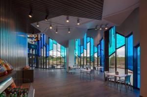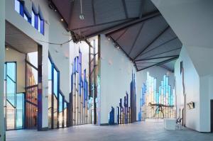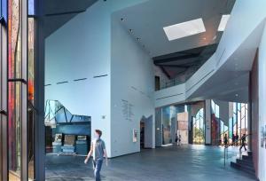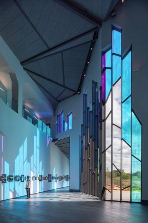 最先進(jìn)的絕緣二向色玻璃專為此項(xiàng)目開發(fā),被認(rèn)為是北美首個(gè)應(yīng)用項(xiàng)目。其獨(dú)特的變色和反光特性給人一種被火焰吞沒的錯(cuò)覺。與充滿活力的外觀形成對(duì)比,無(wú)柱式,大教堂般的內(nèi)部,加上平靜的藍(lán)色和紫色二向色透射光,帶來(lái)寧?kù)o的敬畏感。外墻系統(tǒng)創(chuàng)新地將結(jié)構(gòu)鋼框架和單板幕墻融合成一個(gè)薄的定制系統(tǒng),喚起火焰的短暫性。