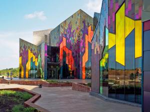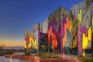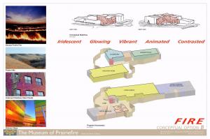 設(shè)計(jì)概念喚起了當(dāng)?shù)乜八_斯地區(qū)最獨(dú)特的一個(gè)方面的圖像:熾焰燎原。從布局到體量,形式,材料和細(xì)節(jié),所有設(shè)計(jì)決策都圍繞了這一概念。綿延不絕的“山丘”形成了舞動(dòng)跳躍“火線”的背景景觀。材料的顏色和反射的動(dòng)態(tài)變化將這些火焰變?yōu)楝F(xiàn)實(shí):彩虹色商務(wù)不銹鋼面板與創(chuàng)新的二向色玻璃混合,使這座博物館坐落在遠(yuǎn)離主干道旁的濕地公園內(nèi),是一個(gè)占地60英畝的新生活工作場(chǎng)所的標(biāo)志性建筑。