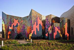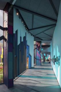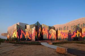 設(shè)計(jì)大膽地與周圍環(huán)境形成鮮明對(duì)比,但通過編排獨(dú)特的材料,形式和技術(shù)來(lái)產(chǎn)生新的和挑釁性的區(qū)域主義,從而融合在地性。為了克服在旅行展覽之間的輾轉(zhuǎn)期間吸引游客的挑戰(zhàn),建筑本身成為一個(gè)展覽項(xiàng)目。豐富多彩的雕塑設(shè)計(jì)重新詮釋了區(qū)域石材的實(shí)踐,融合當(dāng)?shù)鼗規(guī)r的自然分層。色彩偏移LIC(Light Interference Color)的不銹鋼面板采用從藍(lán)色到金色的漸變?cè)O(shè)計(jì),呼應(yīng)意向中的火焰爆發(fā)和火花。