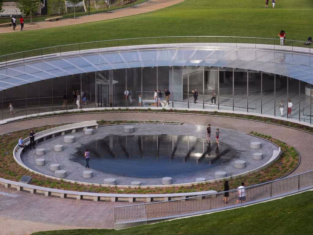 博物館的設(shè)計完全融入了國家公園景觀,尊重了Dan Kiley的原始公園設(shè)計。新的圓形不銹鋼和玻璃入口指的是拱門的材料和形式。這是一個放置在景觀上的弧形,精確地插入到地形中,游客可以通過景觀進(jìn)入建筑,而不是直接從地下下降。當(dāng)你進(jìn)入的時候,明亮的大廳展現(xiàn)了深入地下博物館規(guī)模驚人的展品,提升和活躍的游客體驗,并不斷吸引著人流進(jìn)入。
