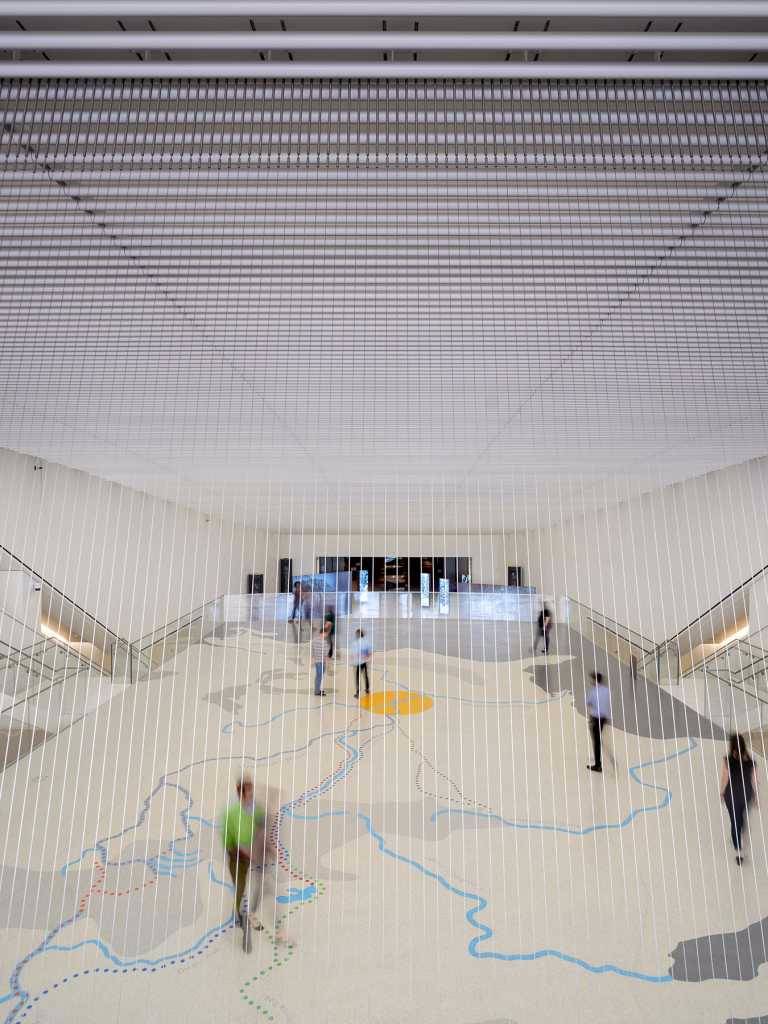 入口大廳下面飄浮著一幅巨大的北美地圖。游客和學(xué)校參觀團(tuán)體可以站在那里,沿著路易斯和克拉克的小道行走,或者沿著向西遷徙的拓荒者的足跡前行。這張地圖也被設(shè)計成一個特殊的活動空間。地圖下面是一個新的教育中心,它填補(bǔ)了公園以前沒有專門空間的空缺。