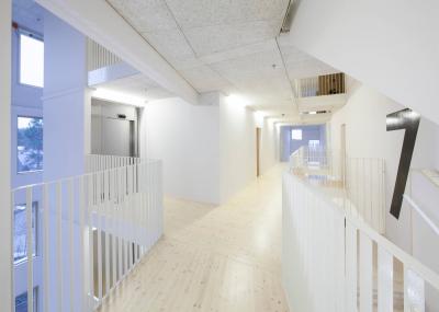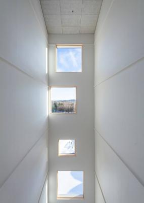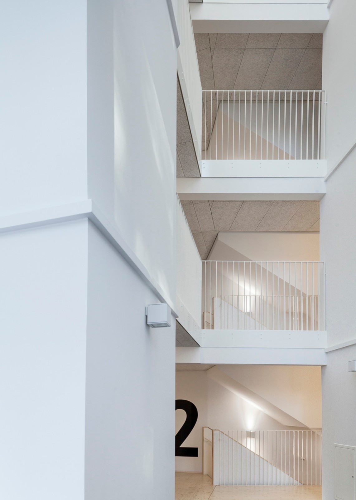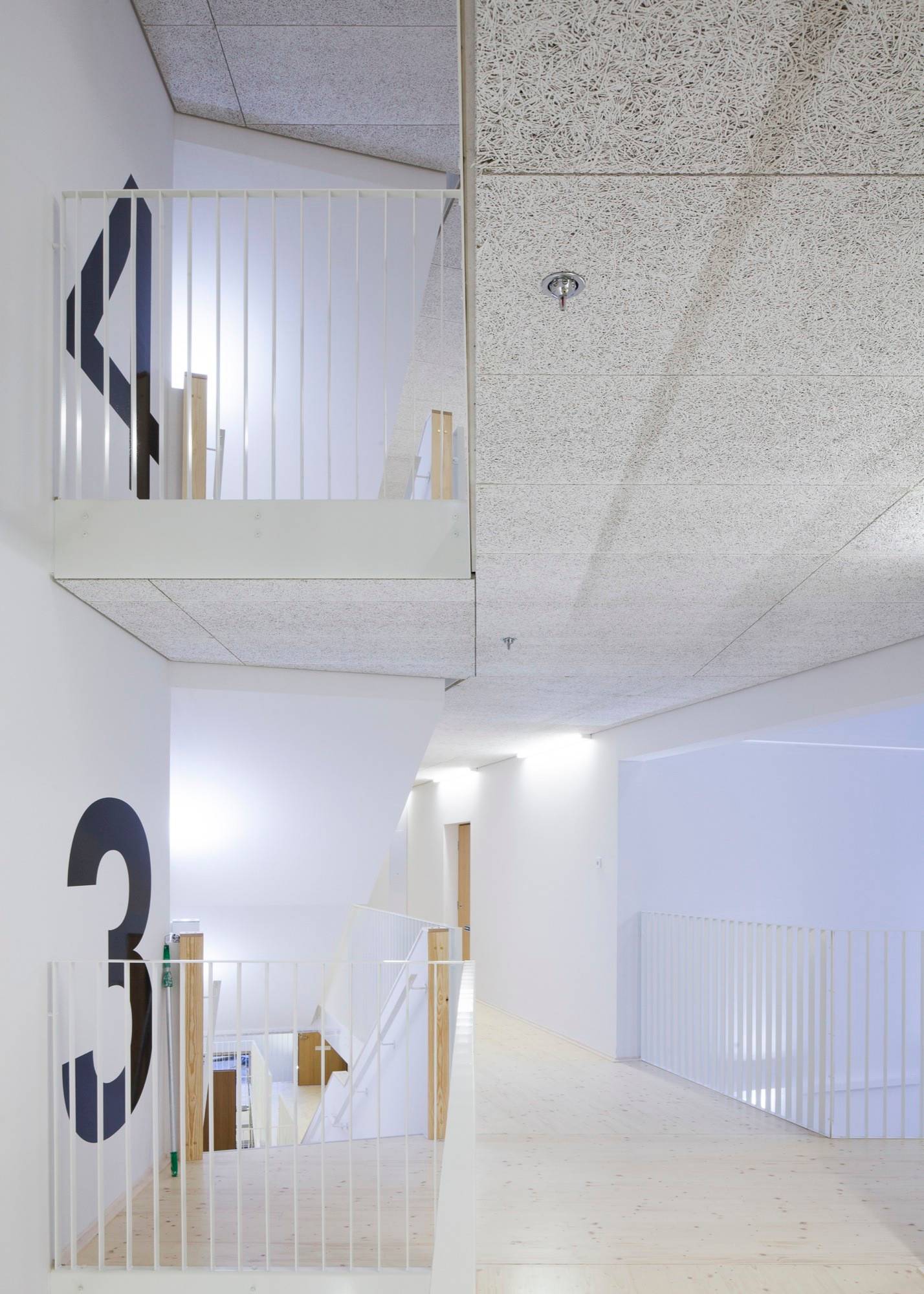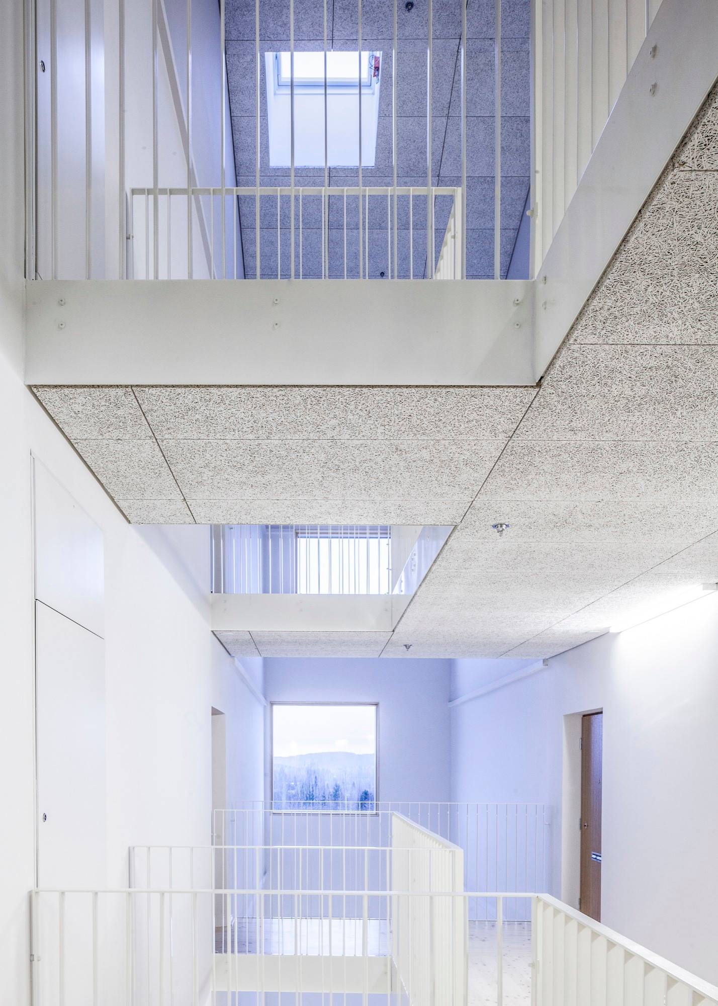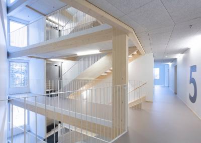 利用CLT系統(tǒng)使得該項(xiàng)目中幾個重要的方面成為可能,比如說可以建造出擁有大量自然光照的寬敞走廊和中庭空間,密集的陽光在這里營造出半溫暖空間,節(jié)能又舒適。大量木材的絕緣特性允許建筑獨(dú)立地控制各個單元的溫度。使用預(yù)制的CLT模塊還能讓走廊的墻壁結(jié)構(gòu)中集成用于熱、水、電和通風(fēng)的管道,易于后期維修。這種安排也允許計(jì)劃的有效組織。這樣的排布方式可以更加有效地進(jìn)行平面功能組織。