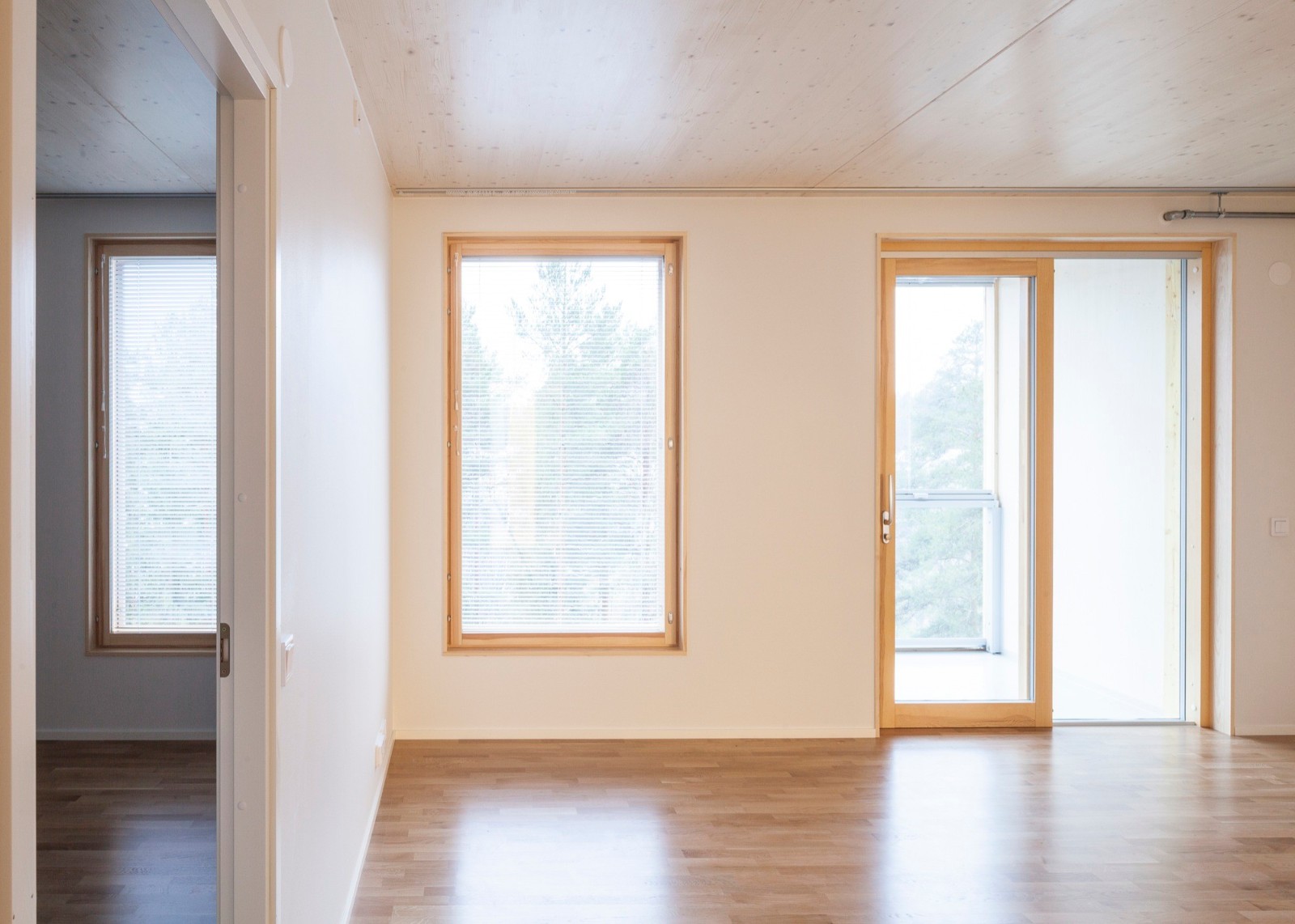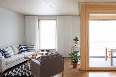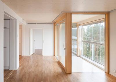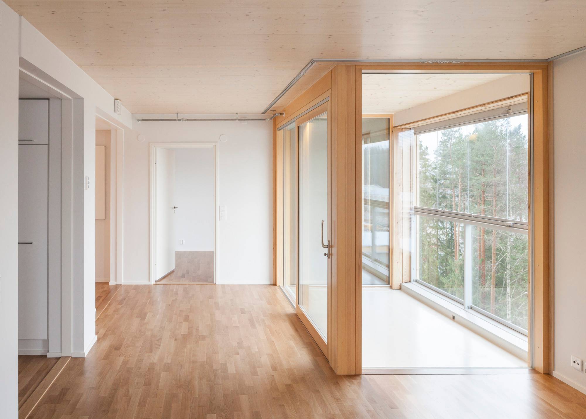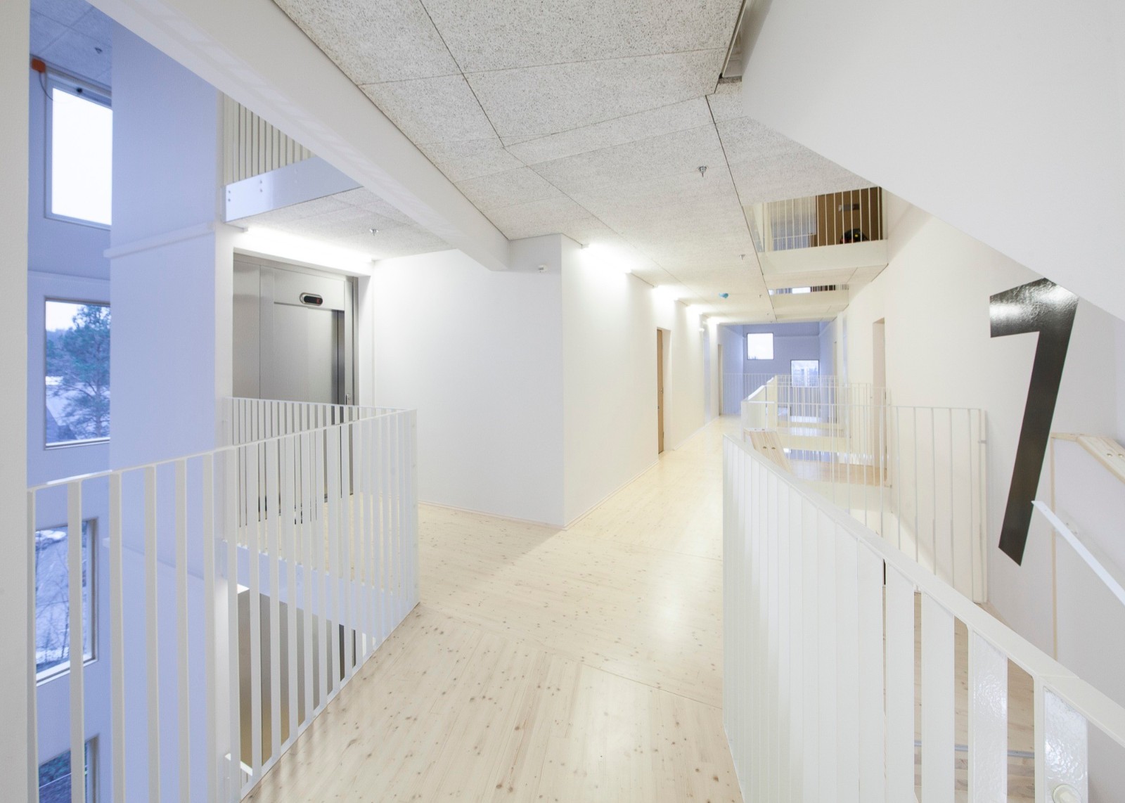 該公寓樓探索了模塊化預(yù)制交叉復(fù)合木材(CLT)建筑的潛力,希望通過這種材料和組件帶來更好的生態(tài)性并提供高品質(zhì)的經(jīng)濟(jì)適用房。Puukuokka試圖最大限度地利用CLT的技術(shù)和美學(xué)特性,大規(guī)模地創(chuàng)造出具有自身獨(dú)特建筑表現(xiàn)力的木質(zhì)建筑。該建筑內(nèi)還采用一種創(chuàng)新的“租賃自有”經(jīng)濟(jì)戰(zhàn)略,目的在于通過促進(jìn)穩(wěn)定的社區(qū)來支持社會的可持續(xù)性。