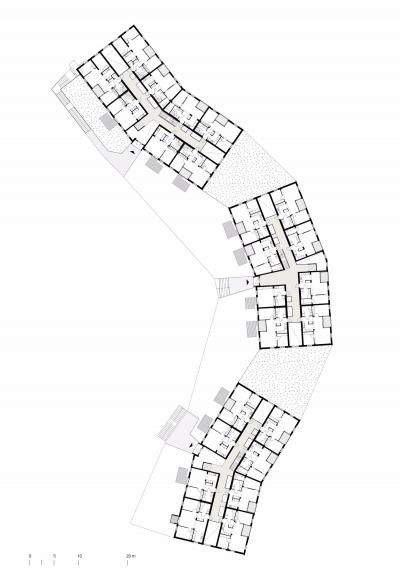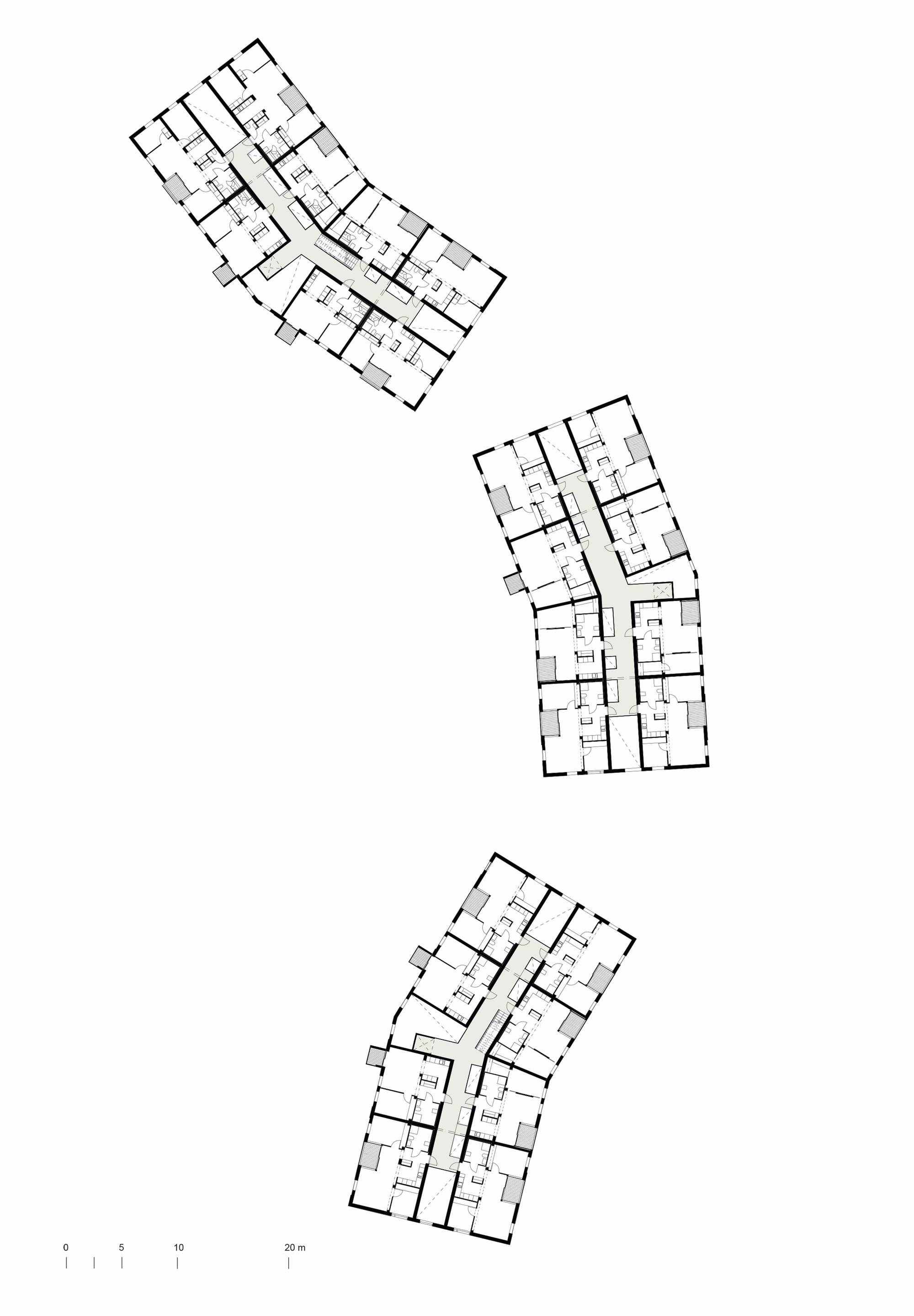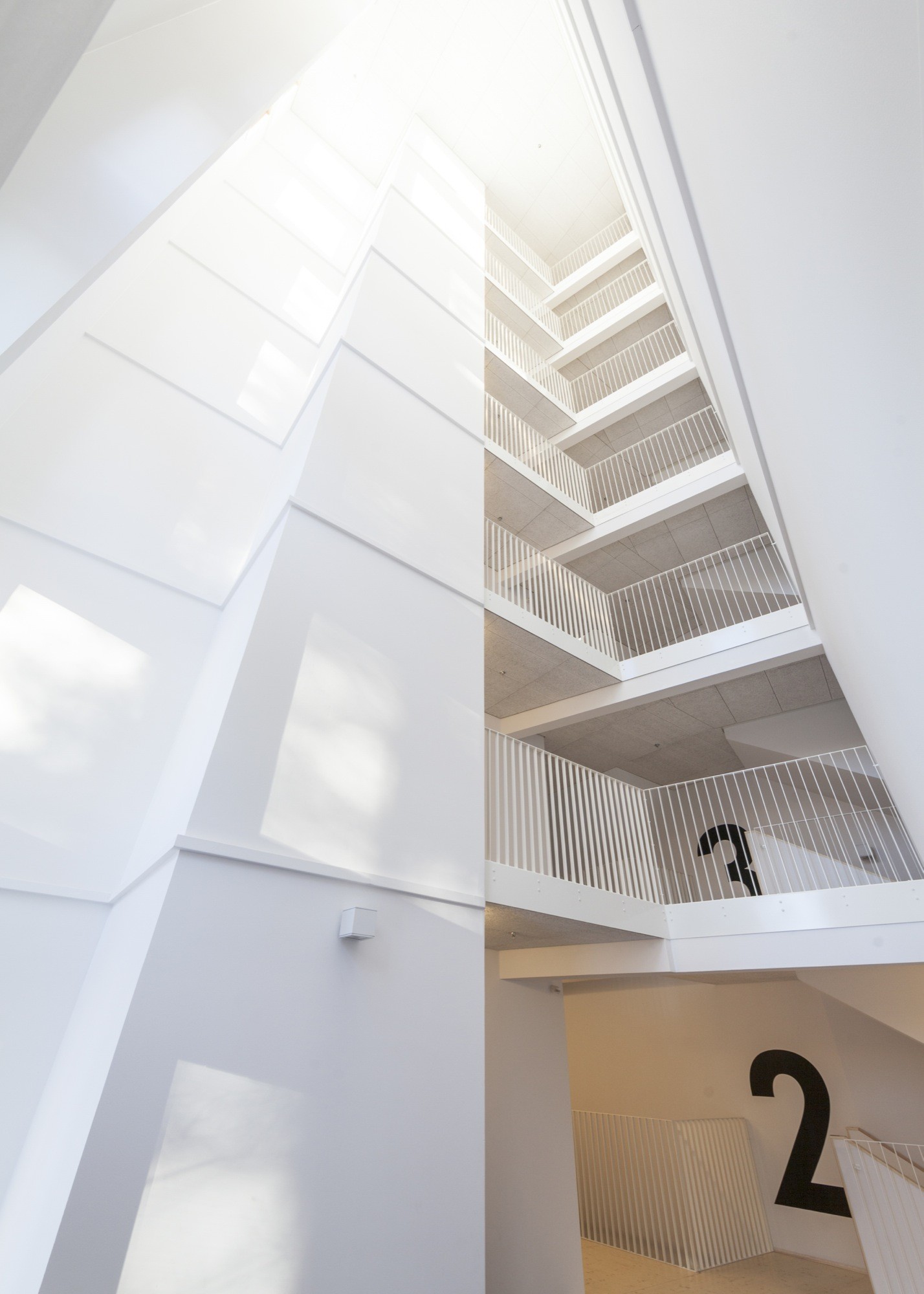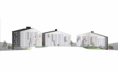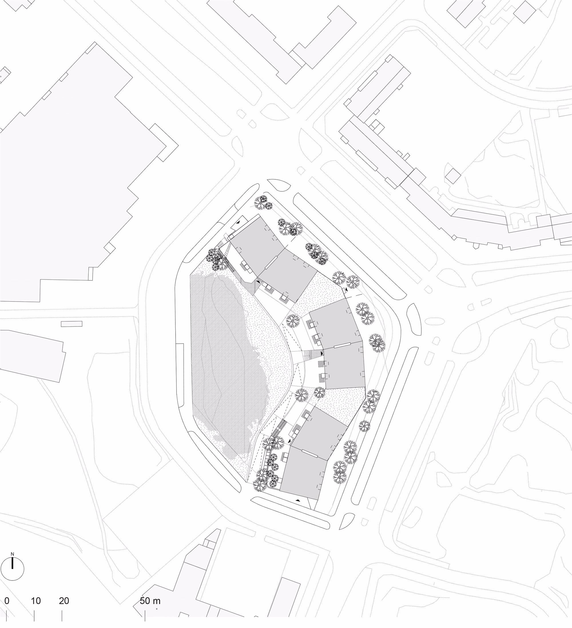 建筑結(jié)構(gòu)結(jié)合了獨(dú)立家庭住宅的隱私感和公寓建筑半公共性質(zhì)的共享空間。這樣設(shè)計(jì)的目的是想通過功能空間為居民提供豐富的體驗(yàn)感。這三座建筑相鄰而建,形成了芬蘭Jyv?skyl? 市Kuokkala社區(qū)的一個街區(qū)。它強(qiáng)調(diào)了城市與周圍山川與湖泊等自然景觀的聯(lián)系。該公寓樓與旁邊2010年同為與OPEEAA設(shè)計(jì)的教堂一起,成為整個社區(qū)的焦點(diǎn)所在。