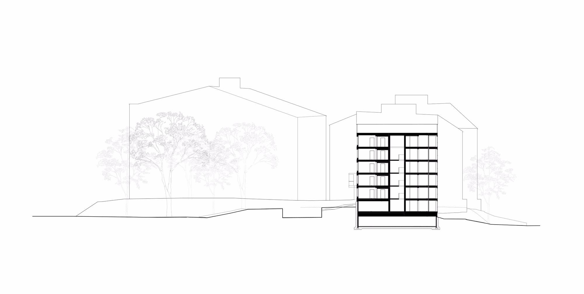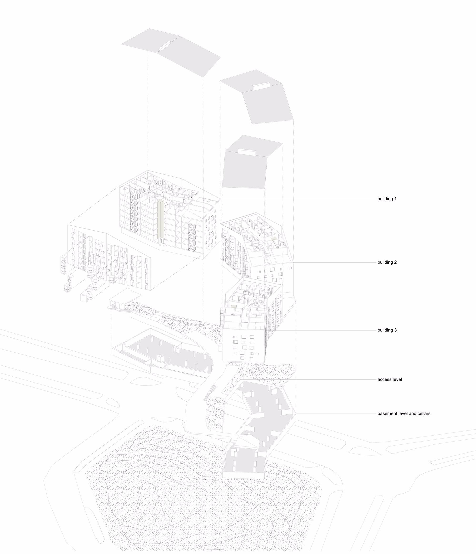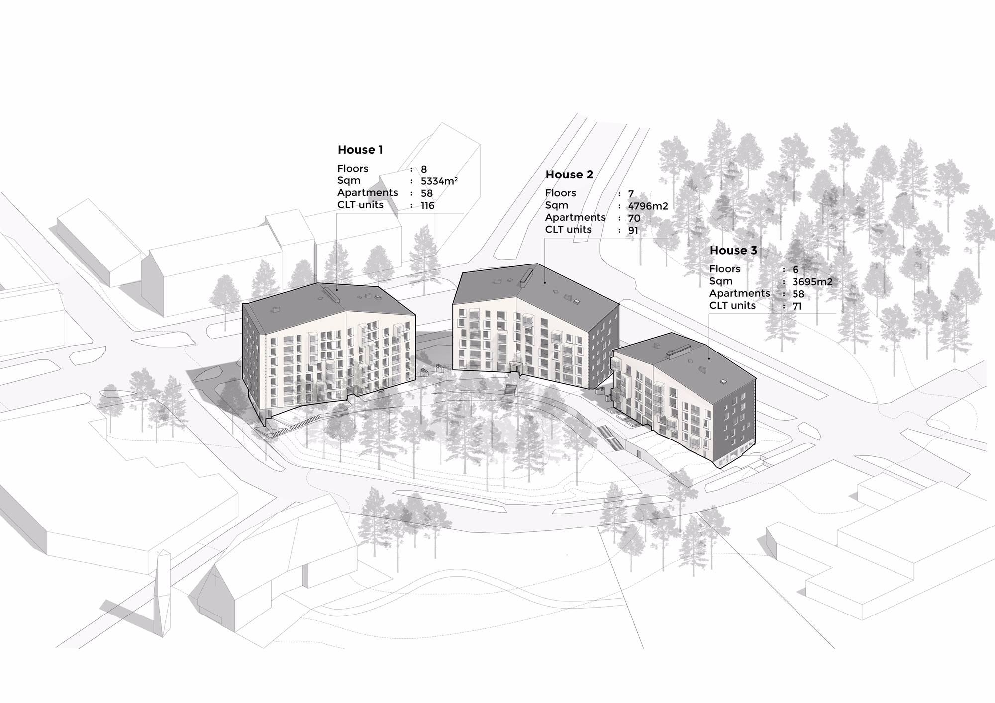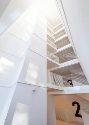 建筑結(jié)構(gòu)結(jié)合了獨(dú)立家庭住宅的隱私感和公寓建筑半公共性質(zhì)的共享空間。這樣設(shè)計(jì)的目的是想通過功能空間為居民提供豐富的體驗(yàn)感。這三座建筑相鄰而建,形成了芬蘭Jyv?skyl? 市Kuokkala社區(qū)的一個街區(qū)。它強(qiáng)調(diào)了城市與周圍山川與湖泊等自然景觀的聯(lián)系。該公寓樓與旁邊2010年同為與OPEEAA設(shè)計(jì)的教堂一起,成為整個社區(qū)的焦點(diǎn)所在。