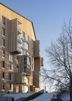Puukuokka公寓樓是芬蘭境內(nèi)首棟八層高的木質(zhì)公寓樓。在本次項(xiàng)目中,OOPEAA事務(wù)所與Lakea公司合作共同設(shè)計(jì)完成,該建筑位于Kuokkala郊區(qū)的Jyv?skyl?,由三棟低能耗建筑組成,旁邊與同為OOPEAA事務(wù)所設(shè)計(jì)的教堂相鄰。