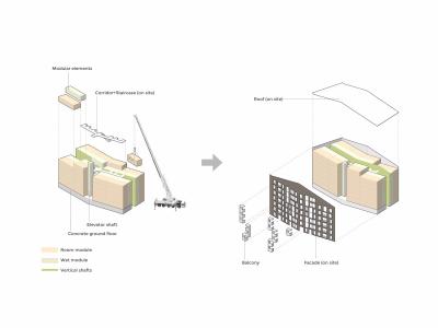 CLT模塊是在離場地不到兩個小時路程的一家當(dāng)?shù)毓S預(yù)制的。預(yù)制模塊的使用使得每棟建筑的現(xiàn)場施工時間減少到六個月成為可能。由于模塊構(gòu)件更少地暴露于各類天氣條件下,有效減少磨損,從而可以在最終的建筑成品中實(shí)現(xiàn)更高的品質(zhì)。