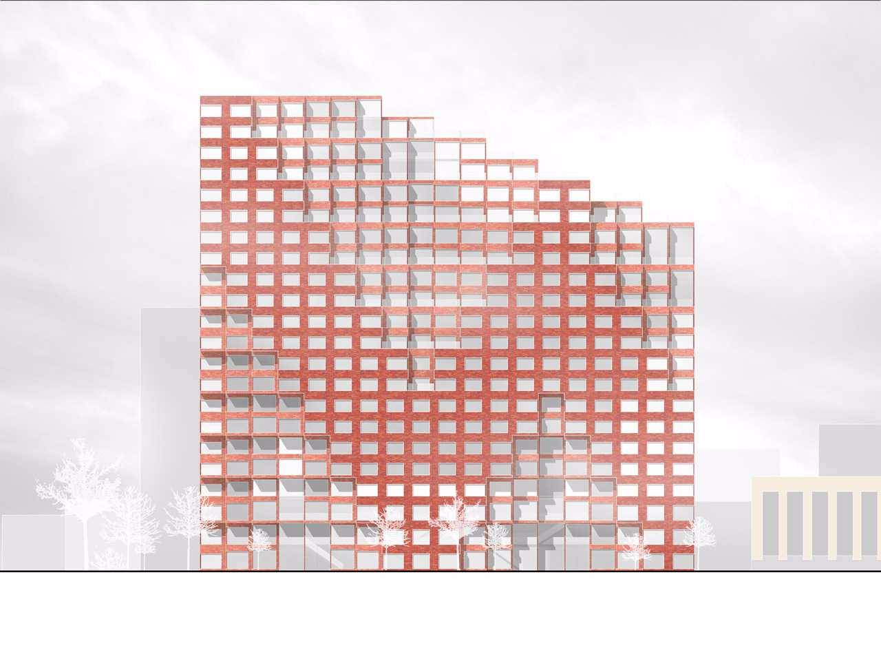 289套公寓中面積從27到253平方米都有,都可以享受到住宅內(nèi)的配套設(shè)施,比如占據(jù)兩層樓的并且?guī)в杏斡境氐慕∩碇行?、帶有露天躺椅的大型室外露臺(tái)、供兒童使用的游戲室、合作空間、可租用的派對(duì)空間、影劇院、購物中心、超市以及最多可以停放284輛車的停車場(chǎng)。此外,方案中使用的模塊化系統(tǒng)能讓建筑擁有更加靈活多變的外部造型和室內(nèi)套型,在同一座公寓中兼?zhèn)渚o湊型套型和大面積套型。建筑體量具有極強(qiáng)的雕塑感和變化性,為創(chuàng)建獨(dú)特的入口空間創(chuàng)造了良好的條件,另外其緩坡式的屋頂設(shè)計(jì)也進(jìn)一步強(qiáng)化了朝向城市的景觀視野。立面頂部和底部的切割依據(jù)有兩點(diǎn),其一是更具內(nèi)部功能的使用需求,另一個(gè)則是要在室內(nèi)空間營(yíng)造的某種品質(zhì)。