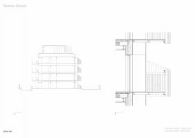 每間公寓具有大進(jìn)深和窄面寬,因此每個(gè)折角陽臺緊密相連,形成富有動感的立面效果。為了與這種平面上的連續(xù)折角相呼應(yīng),也為了保證相鄰兩戶住戶間擁有更好的私密性,建筑師將陽臺的欄桿也設(shè)計(jì)成了一側(cè)高一側(cè)低的形式。這樣的設(shè)計(jì)不僅讓建筑造型更加豐富,還讓住戶欣賞窗外的視野得以擴(kuò)大。