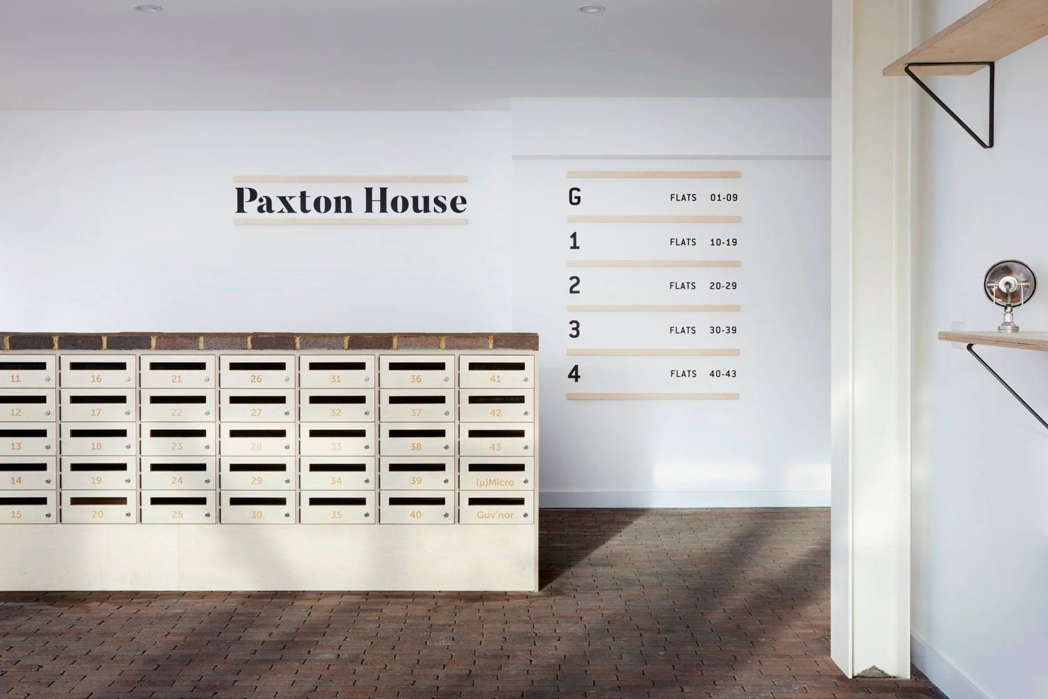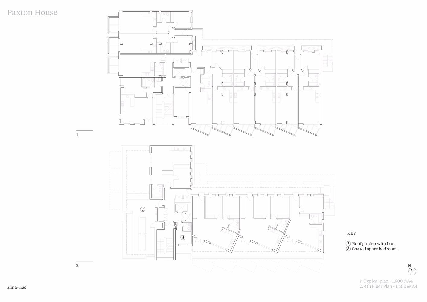 此外, Paxton 集合住宅在入口大廳一側(cè)設(shè)有一片工作區(qū),在頂層設(shè)有一間備用臥室。這些空間為所有住戶共享。工作區(qū)除了與西側(cè)的主入口相連外,還單獨(dú)有一個(gè)南側(cè)的入口,方便住戶從 Cargreen 路直接進(jìn)入。備用臥室可以滿足住戶生活的額外需求。建筑師還貼心地在頂層的公共屋頂露臺設(shè)置了設(shè)備齊全的燒烤區(qū)。完善的公共服務(wù)設(shè)施讓整棟住宅的社區(qū)氛圍濃厚。