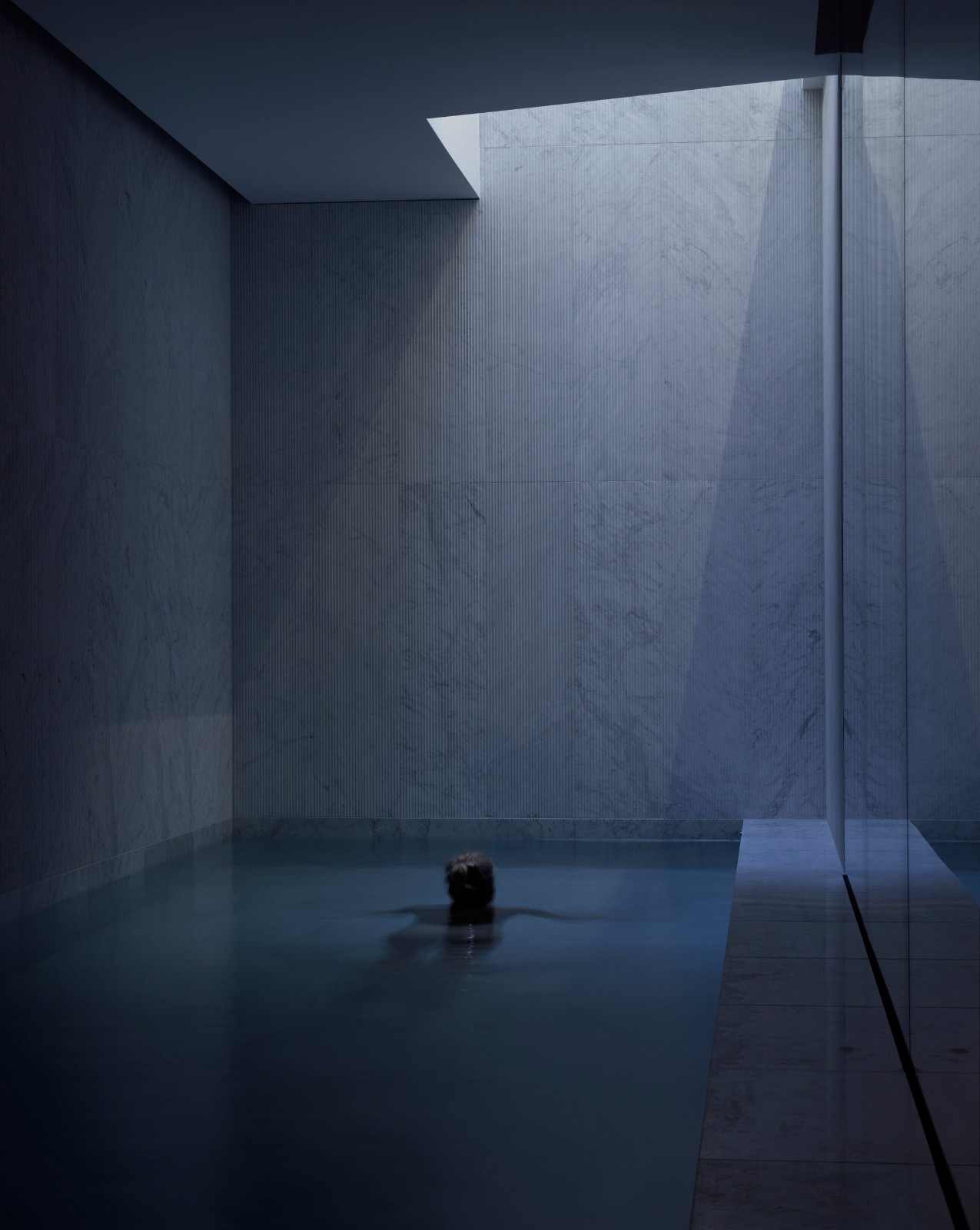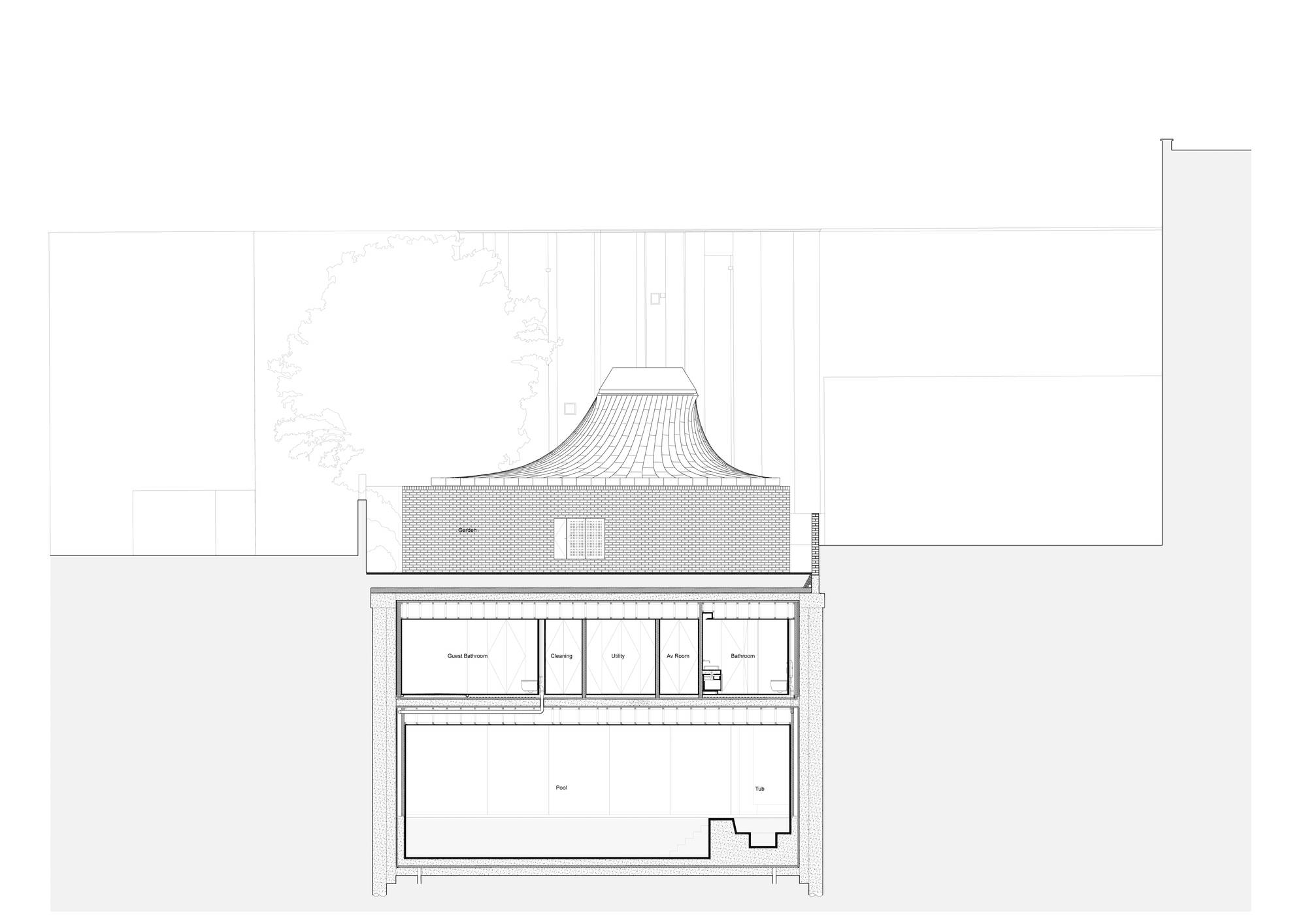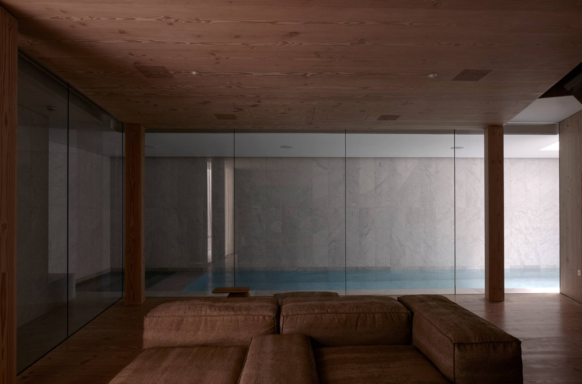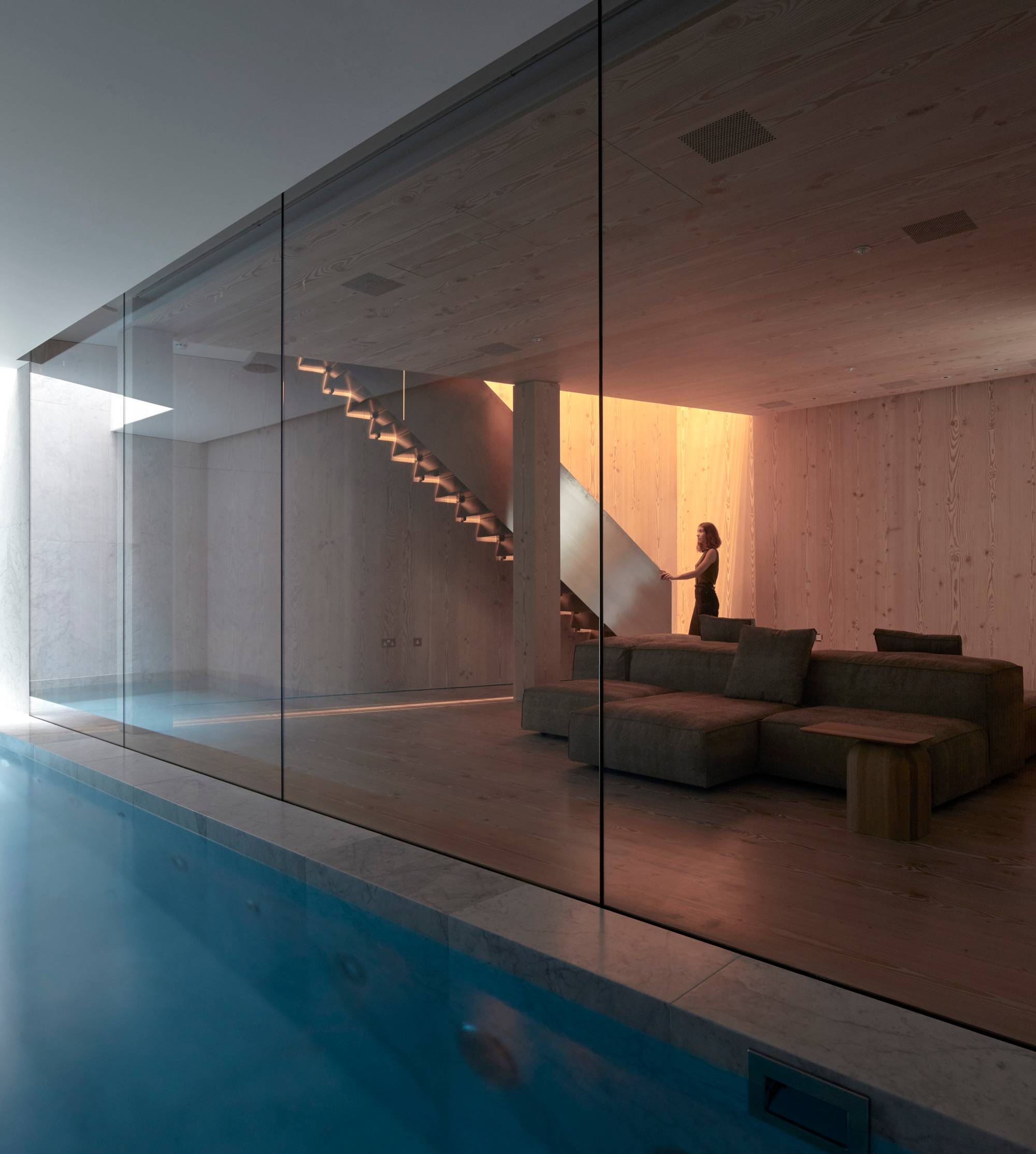 在房子的底層廚房的表面和下面的房間細(xì)節(jié)都會反復(fù)出現(xiàn)銅質(zhì)的裝飾特征,為室內(nèi)增添了微妙的色調(diào)溫暖。道格拉斯冷杉和雕刻的卡拉拉大理石之間冷色調(diào)和暖色調(diào)的對比增加了地下空間的視覺品質(zhì),經(jīng)過仔細(xì)考察后的光暗設(shè)計也是這樣的原理。地面下有兩層。臥室位于第一層,而寬敞的起居和走廊區(qū)則設(shè)有一個10米長的游泳池,位于第二層。光壁和天窗設(shè)計用于優(yōu)化日光的使用,投射頂燈于地板和墻壁上。