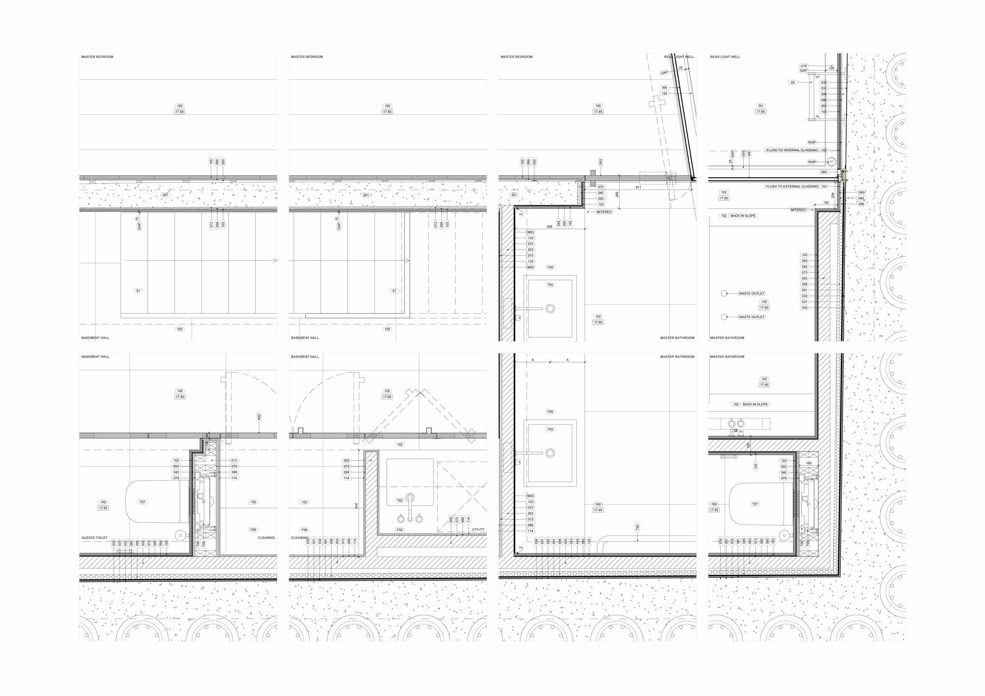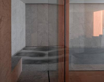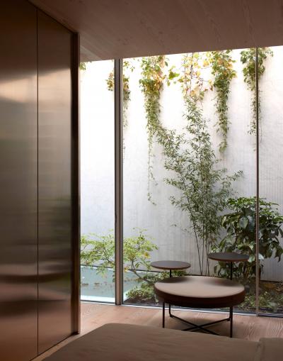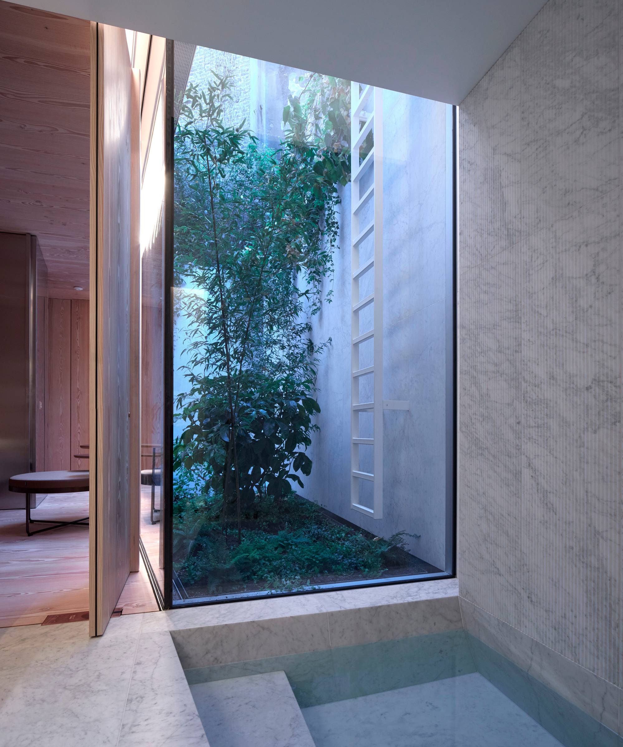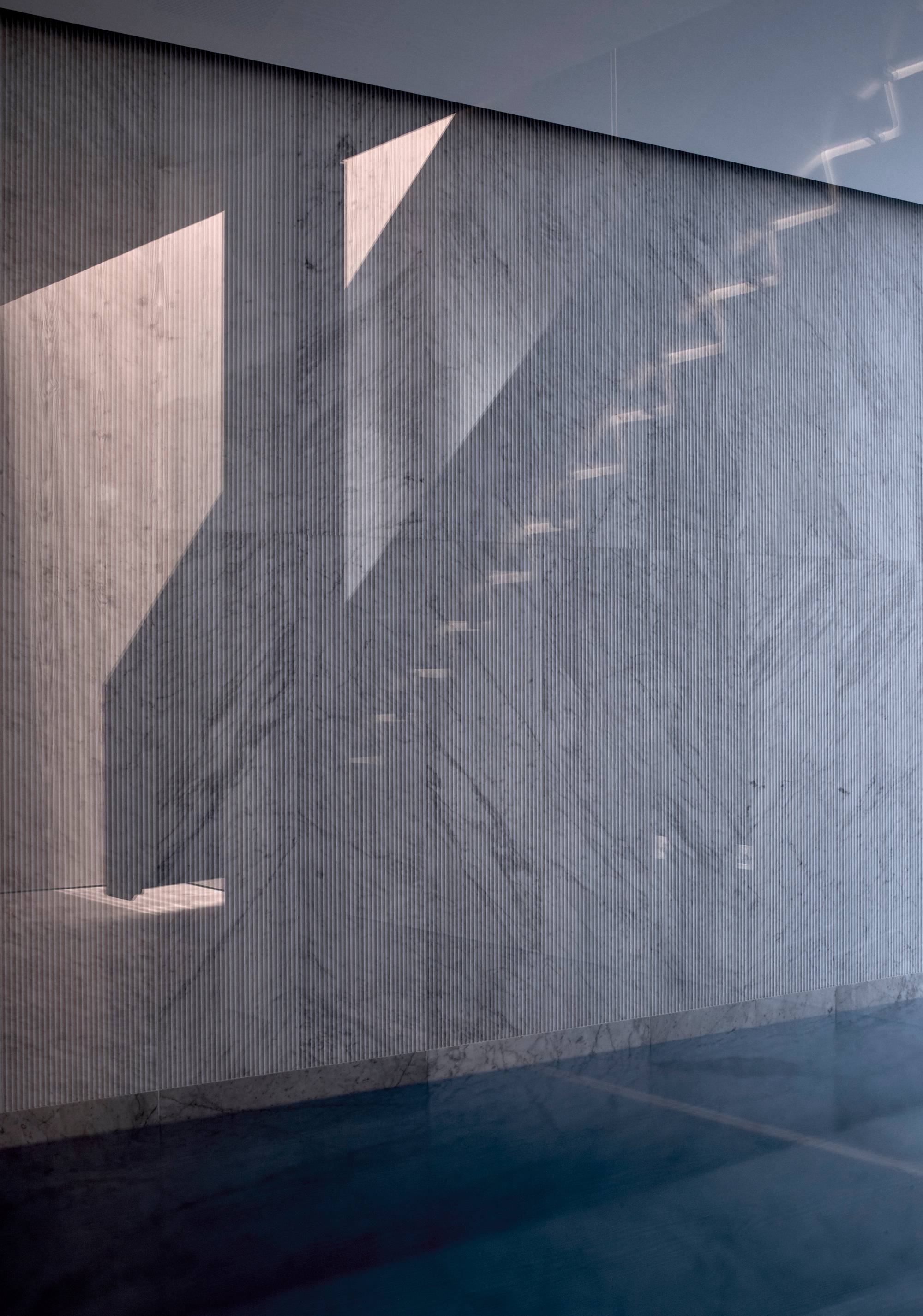 在房子的底層廚房的表面和下面的房間細(xì)節(jié)都會反復(fù)出現(xiàn)銅質(zhì)的裝飾特征,為室內(nèi)增添了微妙的色調(diào)溫暖。道格拉斯冷杉和雕刻的卡拉拉大理石之間冷色調(diào)和暖色調(diào)的對比增加了地下空間的視覺品質(zhì),經(jīng)過仔細(xì)考察后的光暗設(shè)計也是這樣的原理。地面下有兩層。臥室位于第一層,而寬敞的起居和走廊區(qū)則設(shè)有一個10米長的游泳池,位于第二層。光壁和天窗設(shè)計用于優(yōu)化日光的使用,投射頂燈于地板和墻壁上。