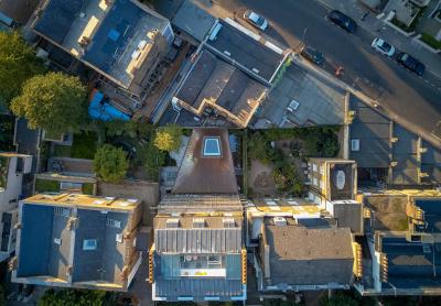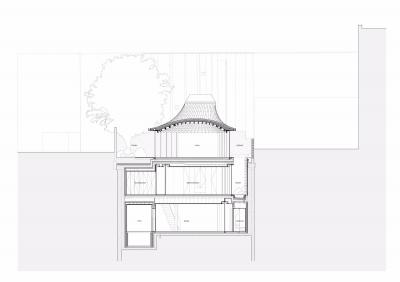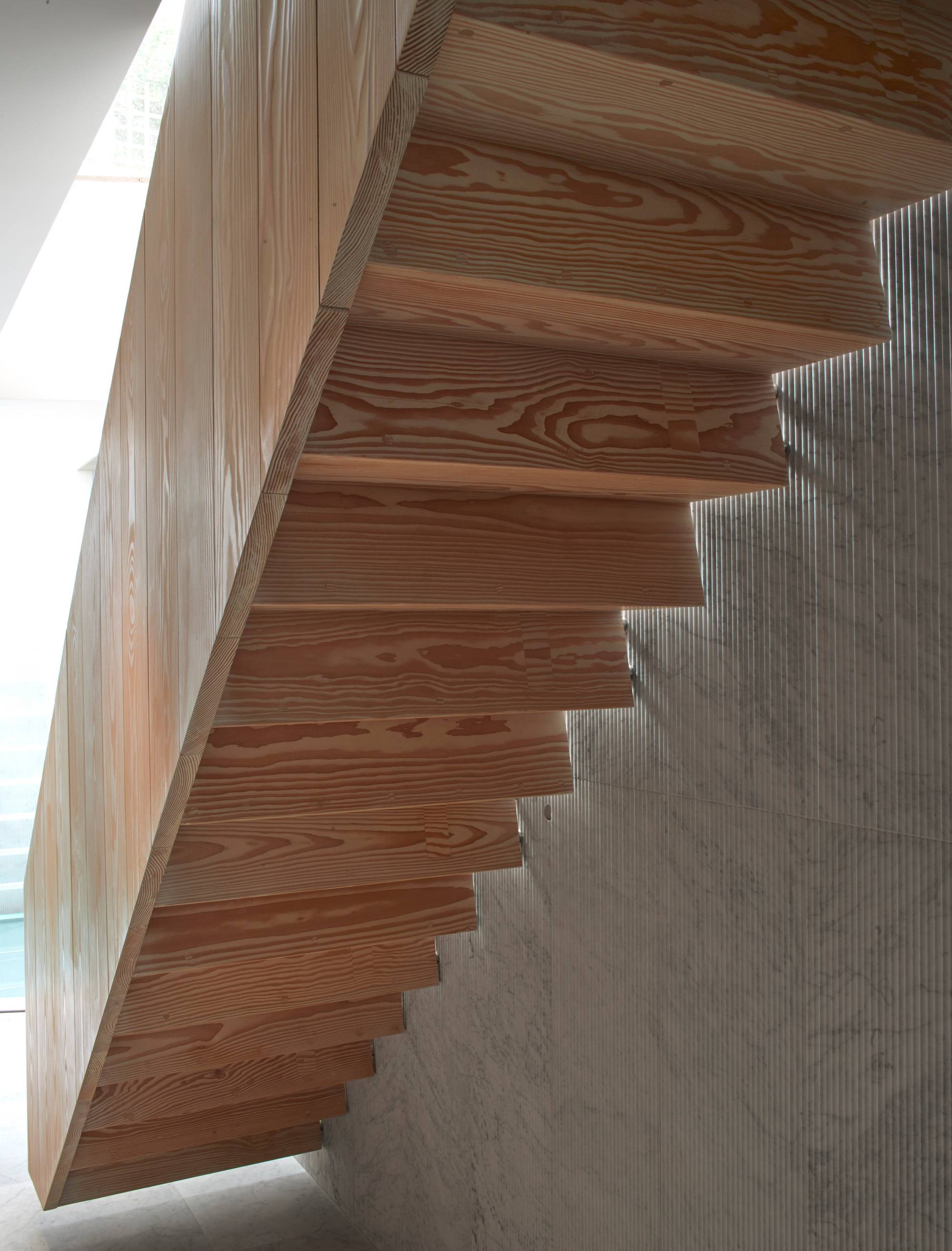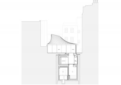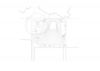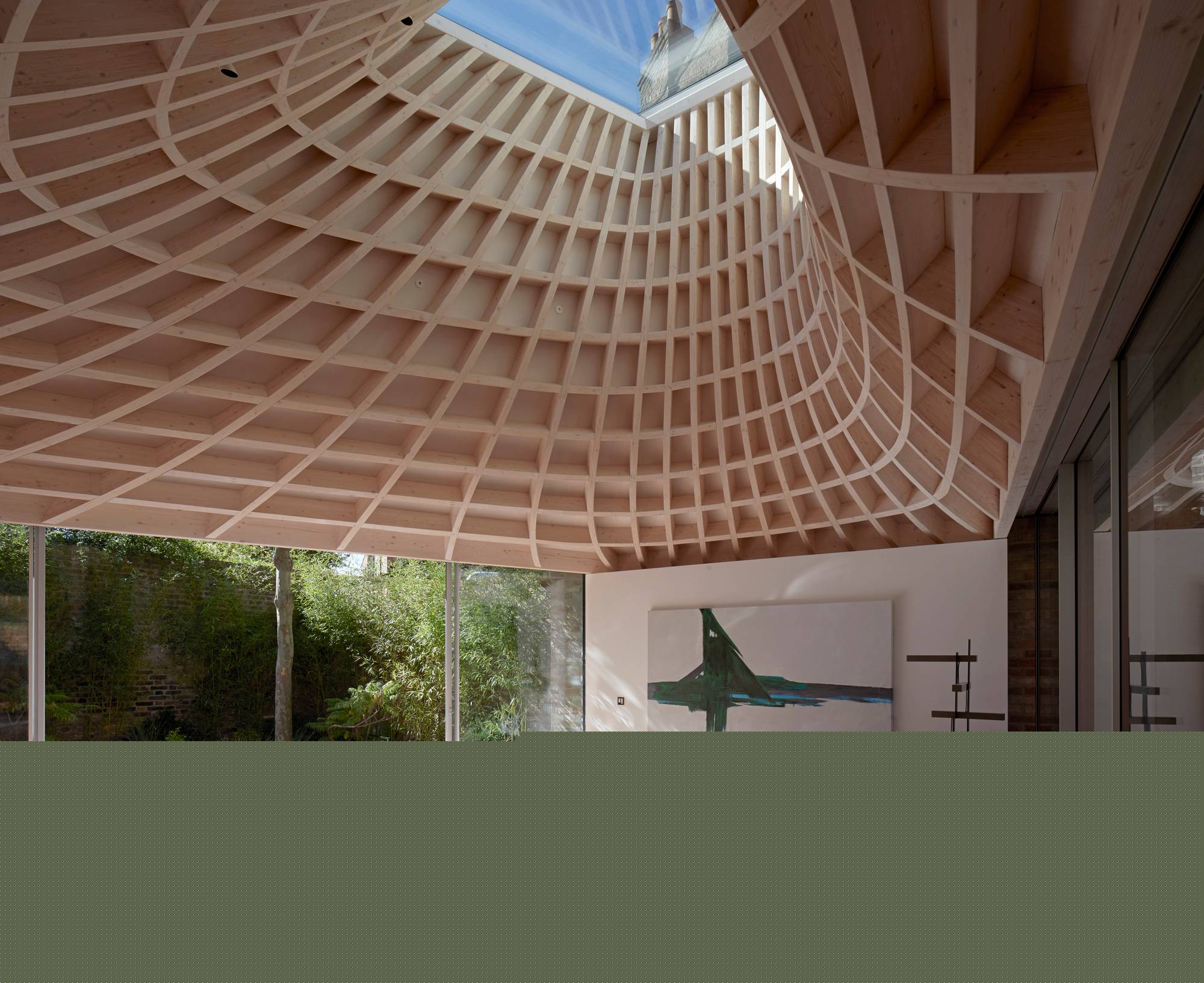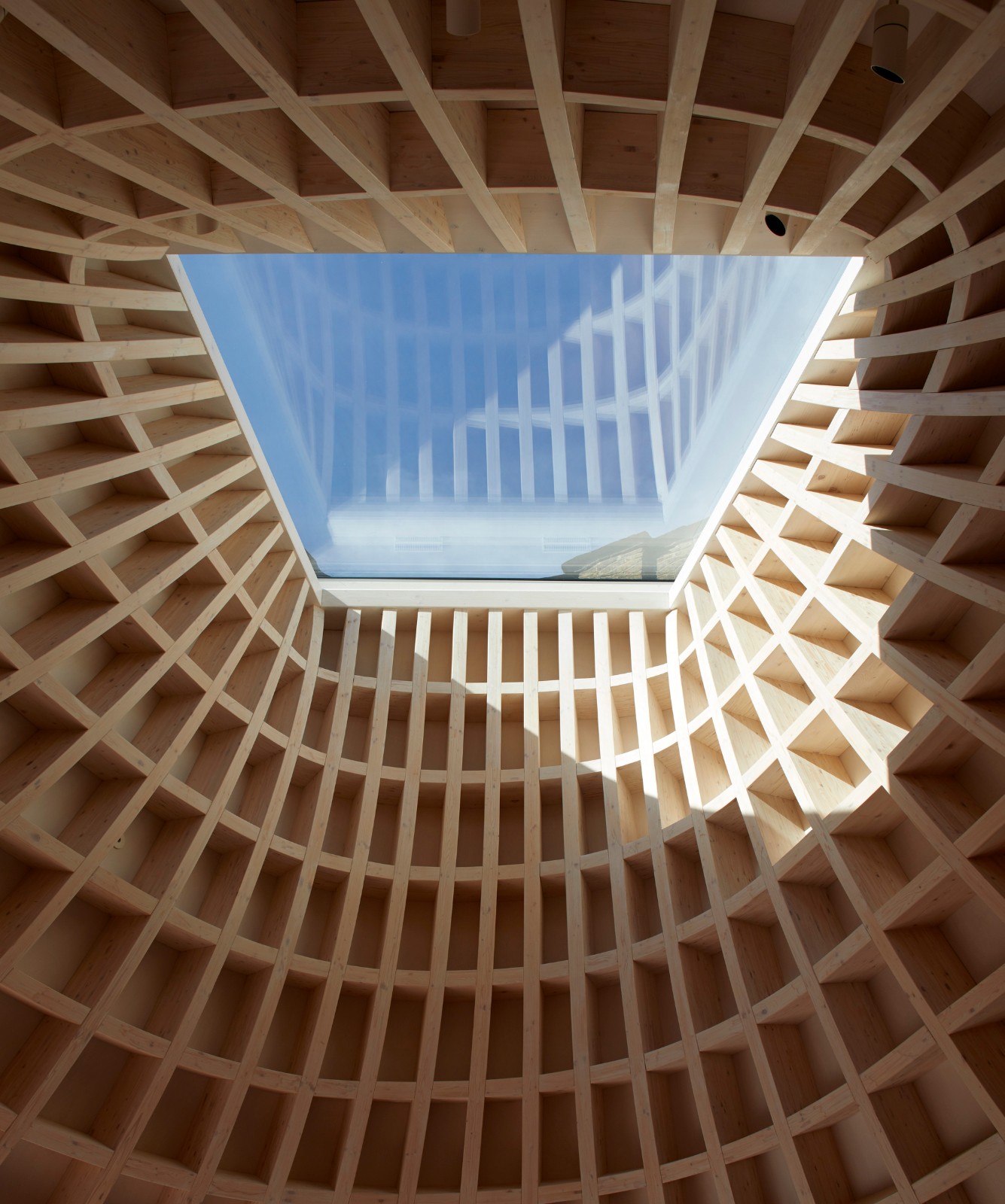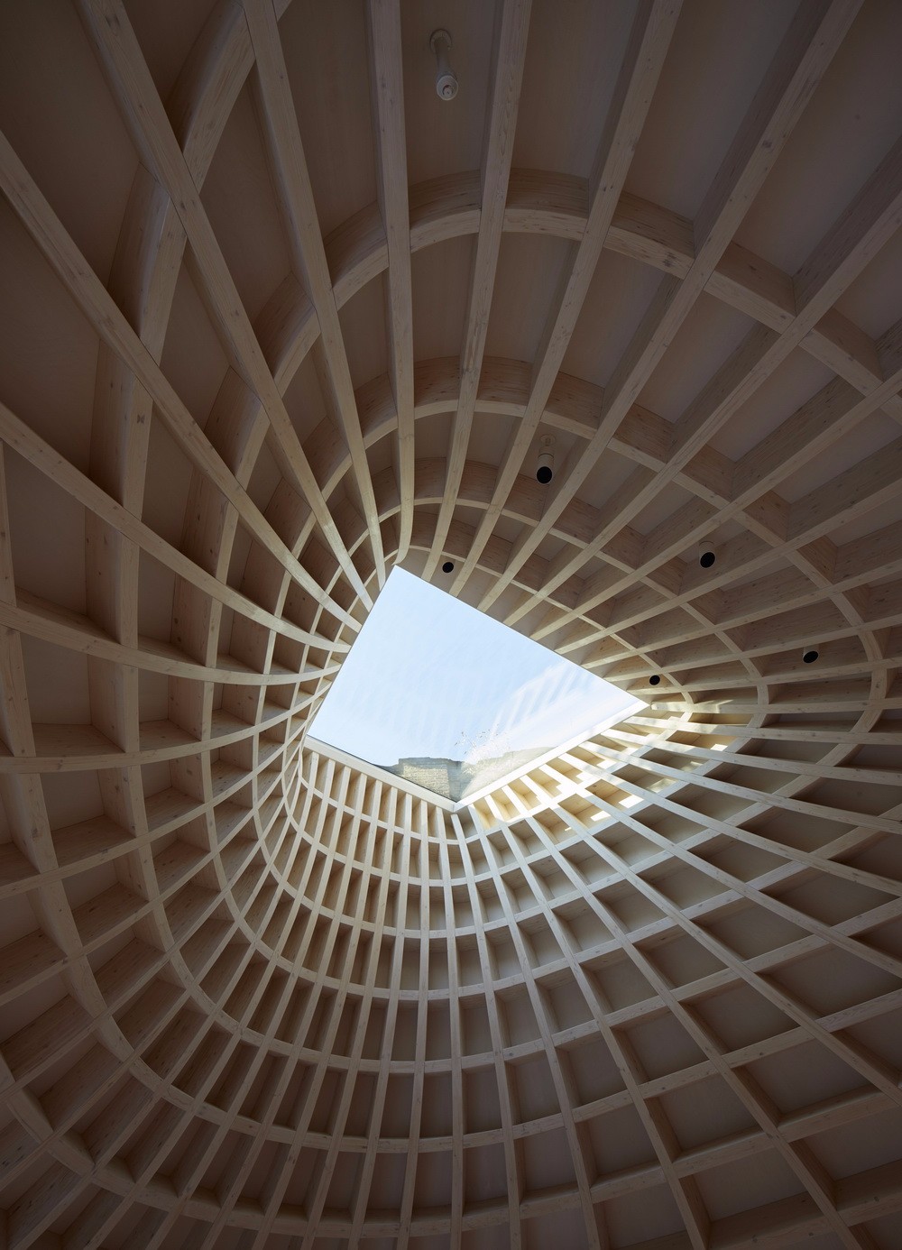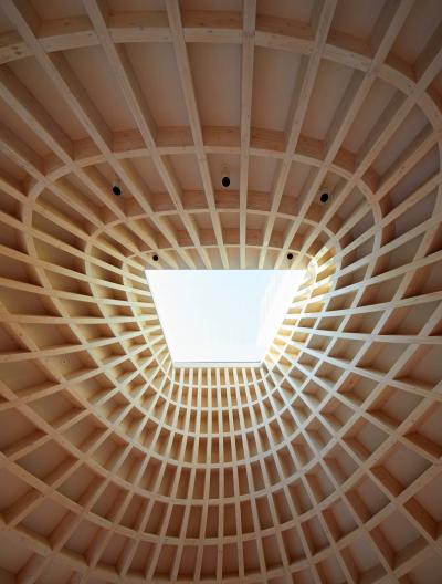 房子外部最明顯的部分是它的亭子,就像一個銅屋頂。在室內(nèi),屋頂由云杉制成的復(fù)雜膠合木構(gòu)架構(gòu)成,其雙曲坡度在玻璃窗中形成。屋頂?shù)母芋w積設(shè)置在起居室的玻璃墻上方,增強(qiáng)了整體的輕盈感,同時將房屋內(nèi)部空間連接到周圍的園景花園以及城市環(huán)境之中。