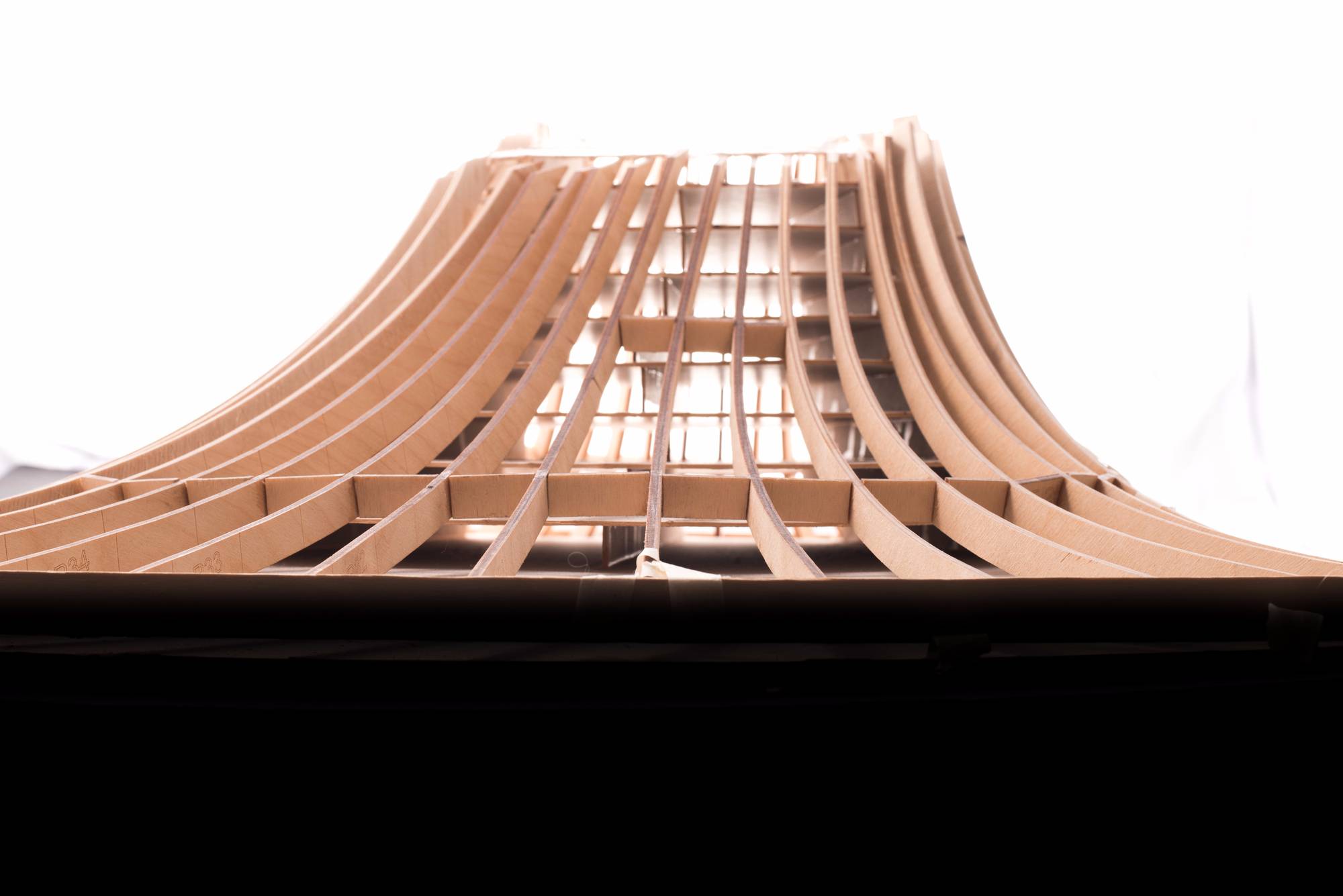 木屋頂結(jié)構(gòu)的每個獨特部分在三個方向彎曲,并根據(jù)Gianni Botsford Architects提供的三維模型在多洛米蒂山預(yù)制。然后將這些碎片構(gòu)件帶到現(xiàn)場,然后分成八個部分進(jìn)行組裝。詹尼·博茨福德如此總結(jié)了這個屋頂?shù)脑O(shè)計概念,“使用數(shù)字和手工工藝進(jìn)行設(shè)計,建模和制造,每個工藝都依靠另一個,復(fù)雜的木屋頂結(jié)構(gòu)的強(qiáng)度掩蓋了其溫暖的居住建筑所擁有的限制性的規(guī)模和特征。