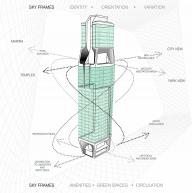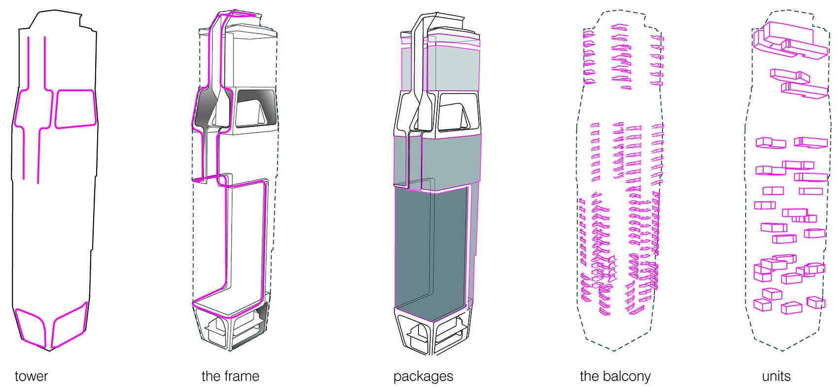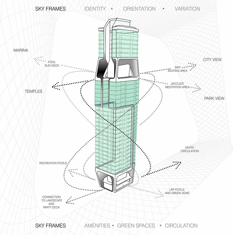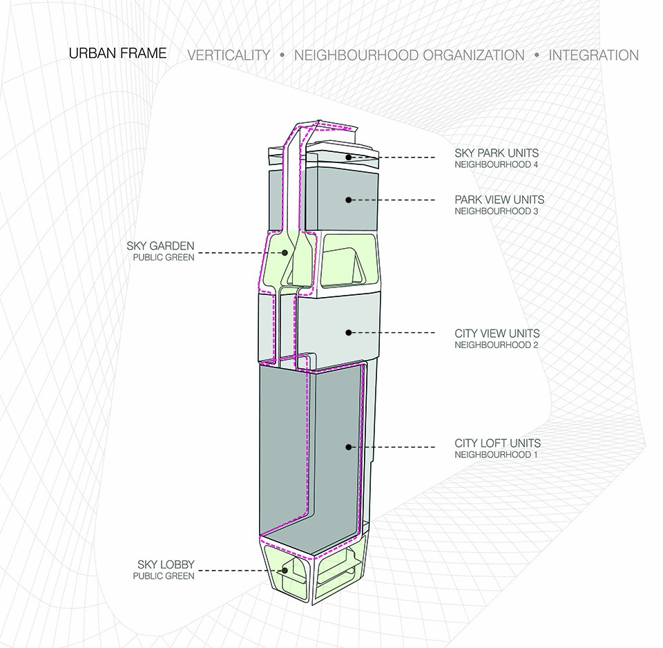 垂直城市的概念與綠化區(qū)域通過(guò)兩種形式緊扣在一起:“垂直框架”和“天空框架”。垂直框架以城市方式組織塔樓。它將塔樓整合為一個(gè)“垂直城市”,將四個(gè)住宅群劃分為不同的小區(qū)。