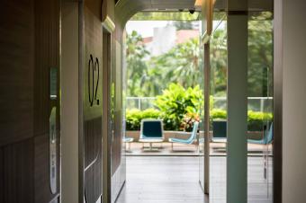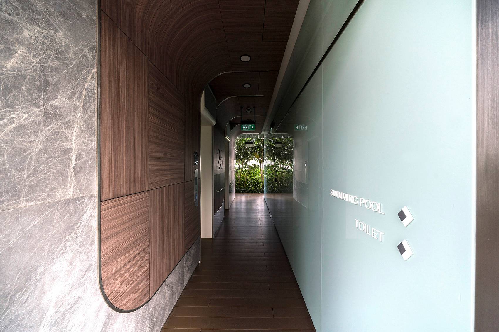 青翠的景觀連接了公共戶外空間,而塔樓升降機(jī)大廳通過(guò)使用天然材料來(lái)引入自然景觀到室內(nèi)。大堂空間主要以柔和的木制線條和優(yōu)雅的大理石地板飾面以強(qiáng)調(diào)自然元素,其余部份則采用油白玻璃以反映和擴(kuò)大空間。大理石磚(90×90厘米)以隨機(jī)圖案布置在地板上,并延伸到大堂墻身,藉以以擴(kuò)展視覺(jué)空間。曲線木制的線條折疊在天花上并橫跨大廳連接大堂兩端,為空間注入活力和暖意。整個(gè)大廳采用的彎曲木制線條與塔樓外部,特別是白色金屬框架遙遙呼應(yīng)。