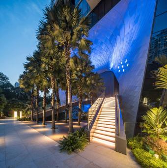 塔樓西側(cè)附近的綠色區(qū)域最初通過(guò)Sitetectonix設(shè)計(jì)的地面景觀概念延伸到Scotts大樓地塊。這個(gè)地面層概念形成一個(gè)多層環(huán)境,將居民可用的不同空間和娛樂(lè)設(shè)施連接在一起?;▓@內(nèi)的娛樂(lè)設(shè)施包括一個(gè)帶陽(yáng)光甲板的50米游泳池、兒童游泳池、游泳池、餐廳和燒烤亭、會(huì)議區(qū)以及按摩和健身室。