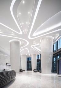 室內空間的設計取意于傳統(tǒng)水墨畫——通過使用不同灰度的色調與漸變,配合燈光及反射,表達截然不同的感覺,營造中和而寧靜的意境。兩層裙樓設有銀行及餐飲業(yè)態(tài),激活臨街的都市生活。