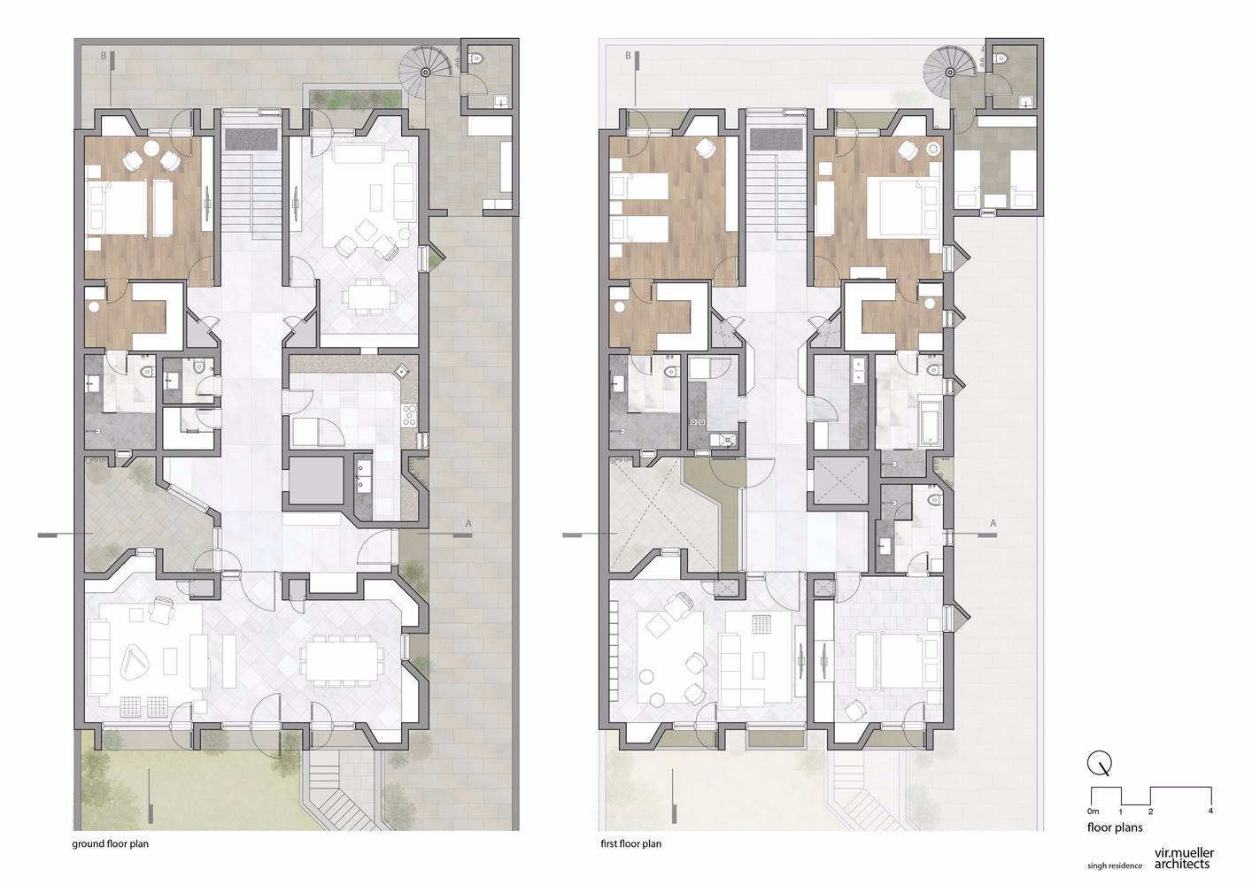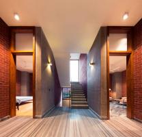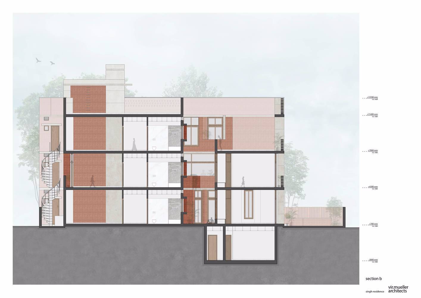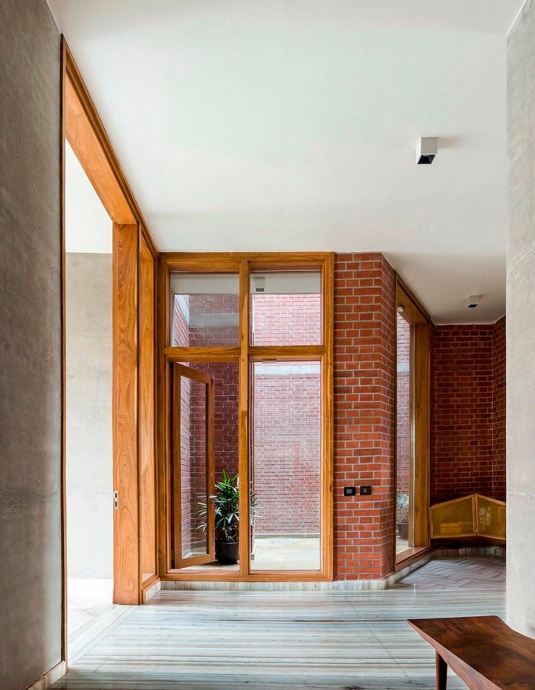 從入口引向主樓梯的是房子中的中央‘街道’軸線,這個(gè)過道是用磚砌承重墻界定出來的,并不時(shí)被主要房間入口所打斷。房子室內(nèi)的地面是用印度Dungri 白色大理石馬賽克鋪成,它的清爽明亮與磚塊的厚重深邃形成對(duì)比。