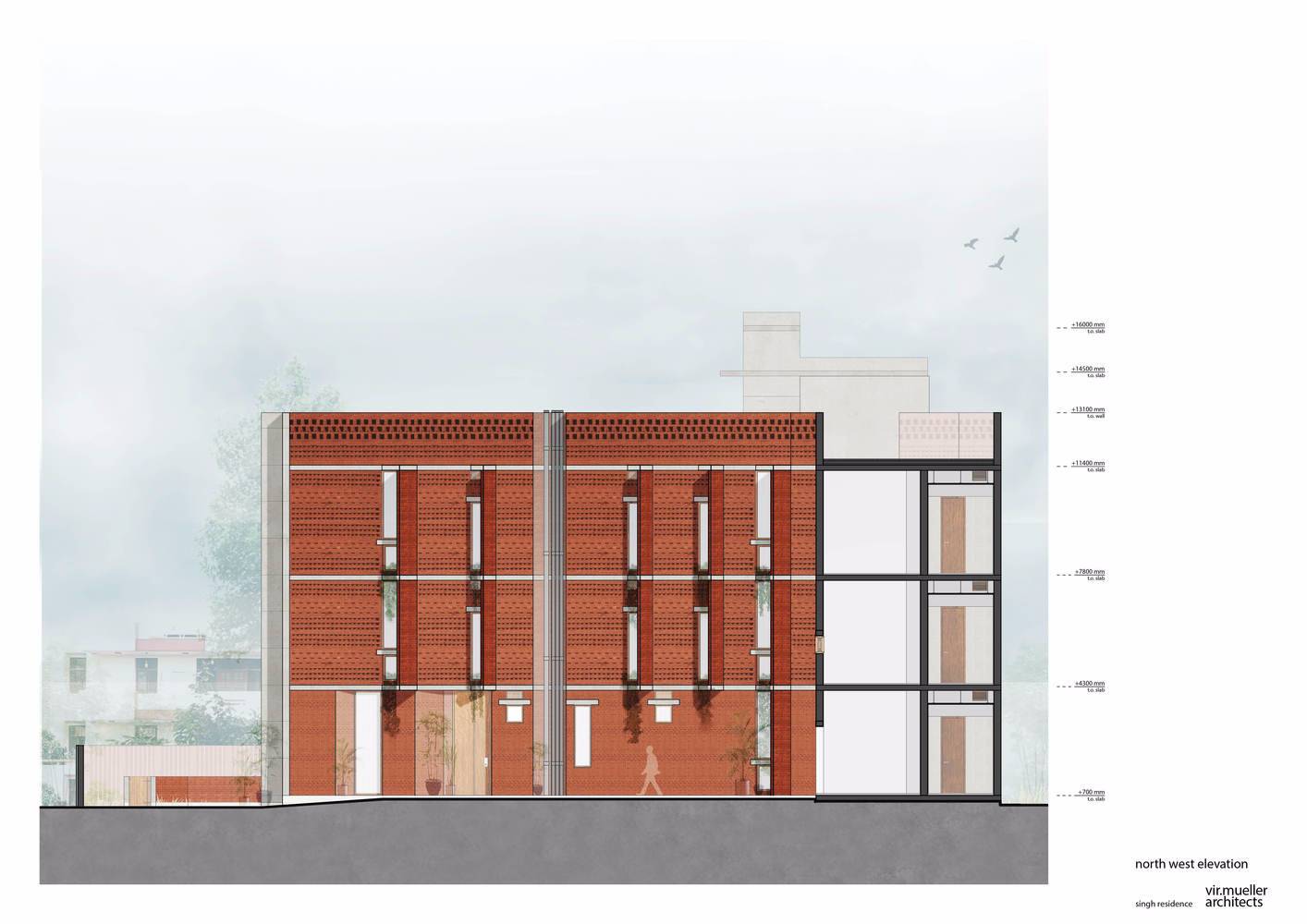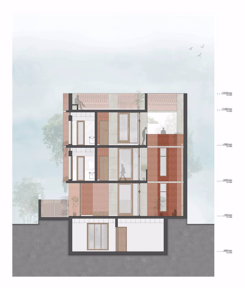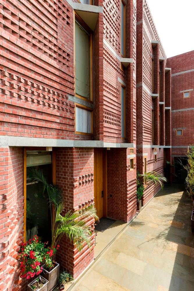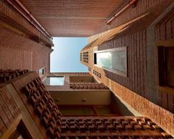 這座磚房子是為一個(gè)幾代同堂關(guān)系親密的印度大家庭設(shè)計(jì)的。從房子的主入口進(jìn)去是一個(gè)內(nèi)部庭院,它為房子的核心部分提供了采光和通風(fēng)。用磚塊砌出的圖案豐富了庭院空間,天空中投下的光線也在上面留下斑駁的影子。