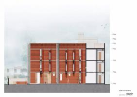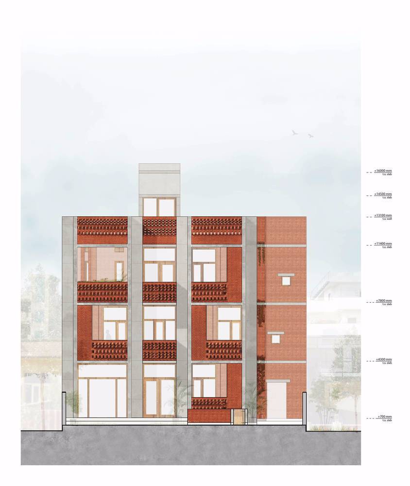 房子的外部立面上,簡(jiǎn)單地用磚塊砌出起伏波浪狀的半遮蓋物,這一動(dòng)感元素構(gòu)成的表皮為房子阻隔了光熱和塵土。這座房子呈現(xiàn)出合理的生成邏輯,包括了對(duì)周圍環(huán)境的響應(yīng),這就是用材料應(yīng)對(duì)光照和周圍的實(shí)際情況后,形成正在鼓動(dòng)的帆布般的形態(tài)。