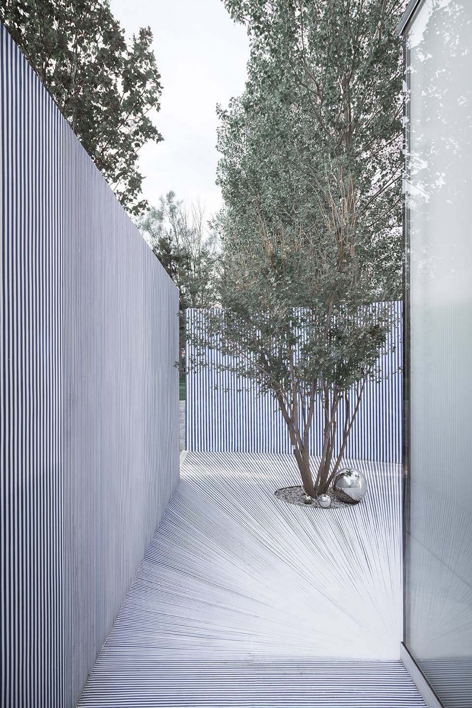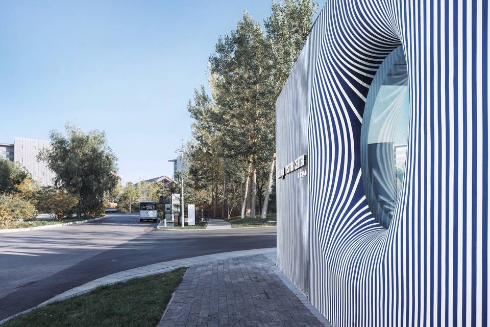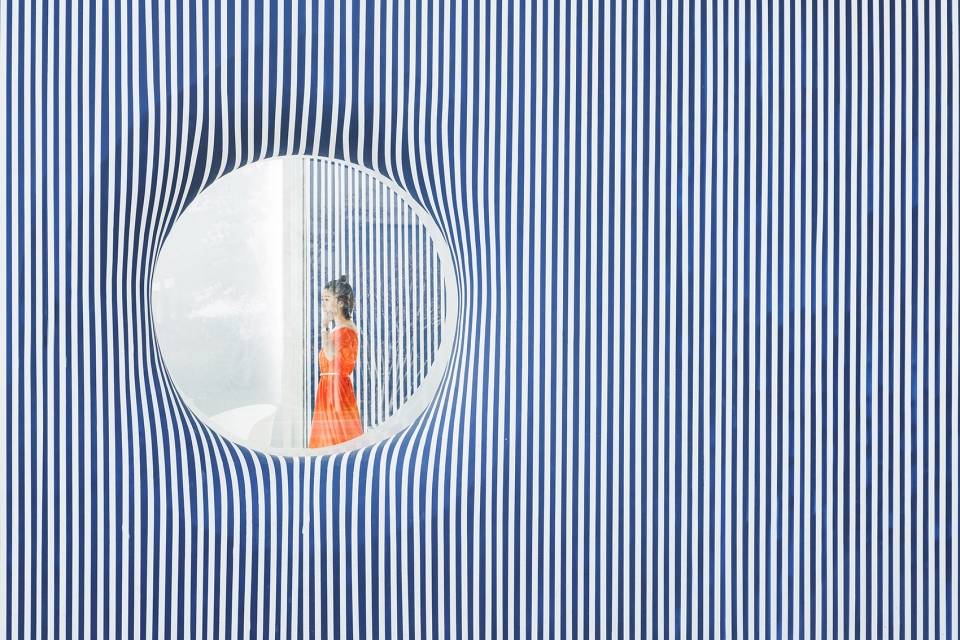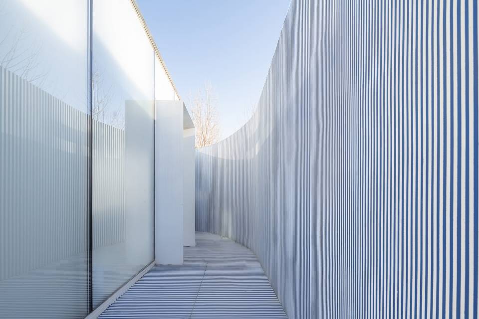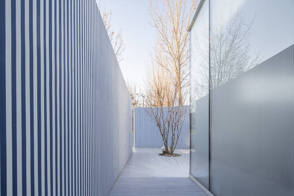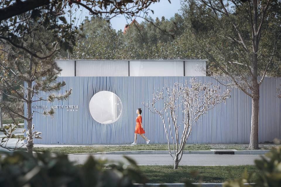 大海,這個(gè)突然觸動(dòng)我聯(lián)系到?;晟?,這個(gè)典型的水手服裝的典型圖案。我決定用條紋去覆蓋整個(gè)圍墻和場(chǎng)地。沒錯(cuò),條紋會(huì)削弱圍墻的實(shí)體感受,并創(chuàng)造出一種暈眩感,這暈眩感會(huì)在立面上創(chuàng)造一種新的不確定和曖昧,結(jié)合圍墻的圓洞,和玻璃盒子內(nèi)的功能發(fā)生聯(lián)系。由此這個(gè)設(shè)計(jì)達(dá)成了我的實(shí)驗(yàn)?zāi)康?。盡管手段并不是預(yù)先設(shè)定的。