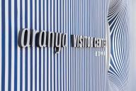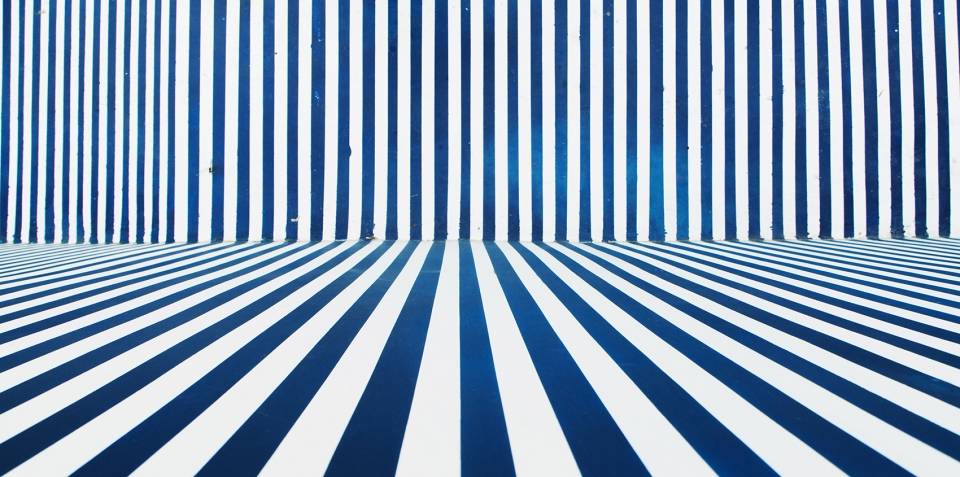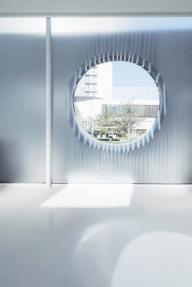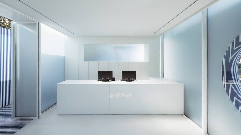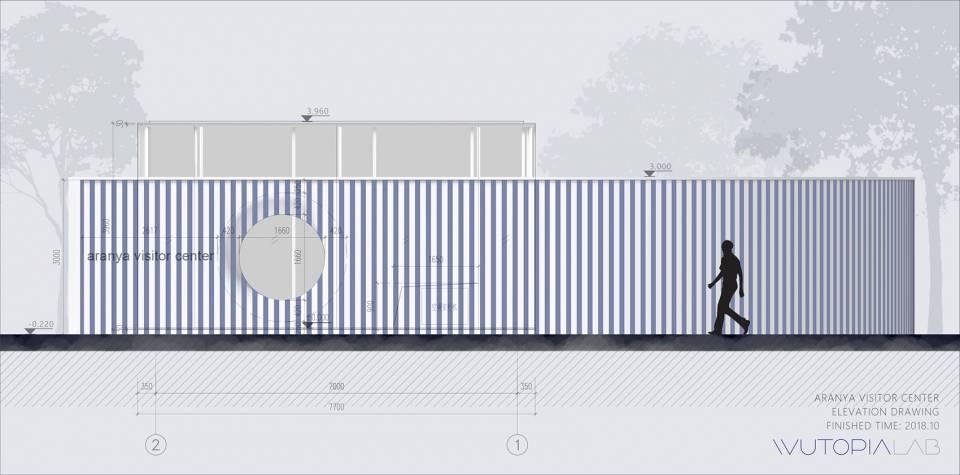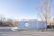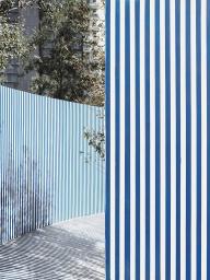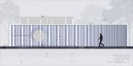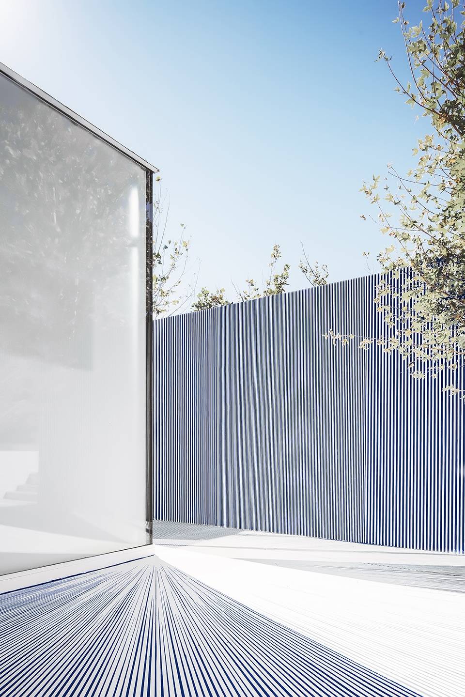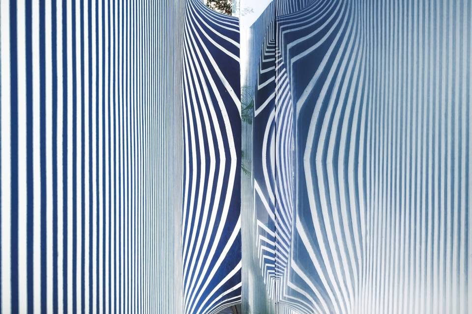 大海,這個(gè)突然觸動(dòng)我聯(lián)系到?;晟?,這個(gè)典型的水手服裝的典型圖案。我決定用條紋去覆蓋整個(gè)圍墻和場(chǎng)地。沒錯(cuò),條紋會(huì)削弱圍墻的實(shí)體感受,并創(chuàng)造出一種暈眩感,這暈眩感會(huì)在立面上創(chuàng)造一種新的不確定和曖昧,結(jié)合圍墻的圓洞,和玻璃盒子內(nèi)的功能發(fā)生聯(lián)系。由此這個(gè)設(shè)計(jì)達(dá)成了我的實(shí)驗(yàn)?zāi)康?。盡管手段并不是預(yù)先設(shè)定的。