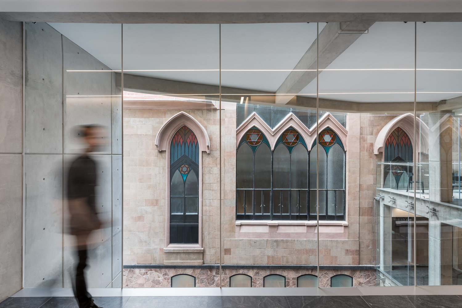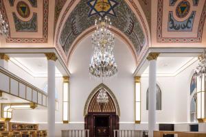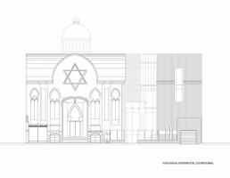 游人在新廣場上可能會注意到新建筑所采用的的玻璃面能夠反射出老建筑的形態(tài),因為它們兩個分別立在廣場的兩邊,且高度相同。在教堂內(nèi)部,新建筑與原有的猶太教堂層高相同,以示尊敬,并且僅在一處位置上有所連接。屋頂?shù)谋壤町愅怀隽诉@一連接體,這讓任何人都對重建后的猶太教會堂心生敬畏。