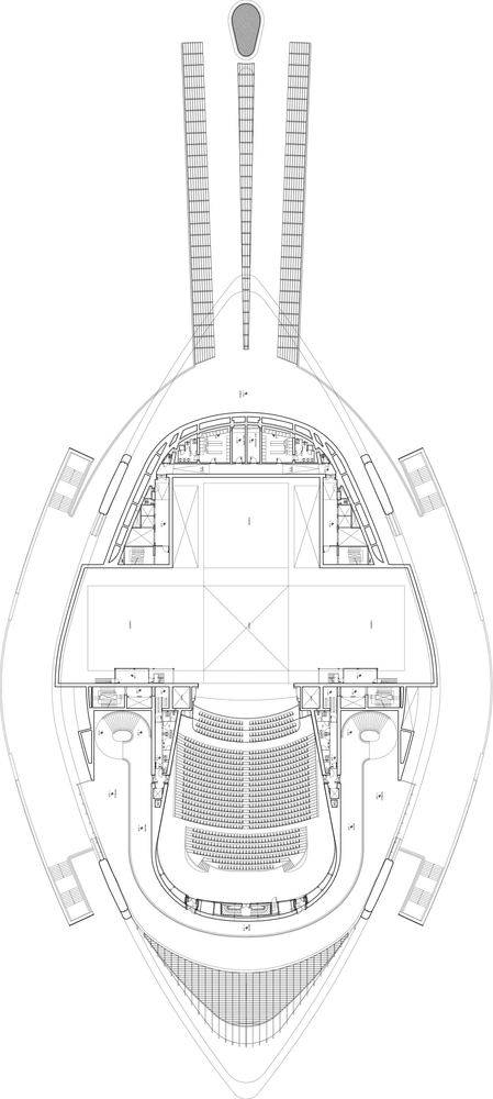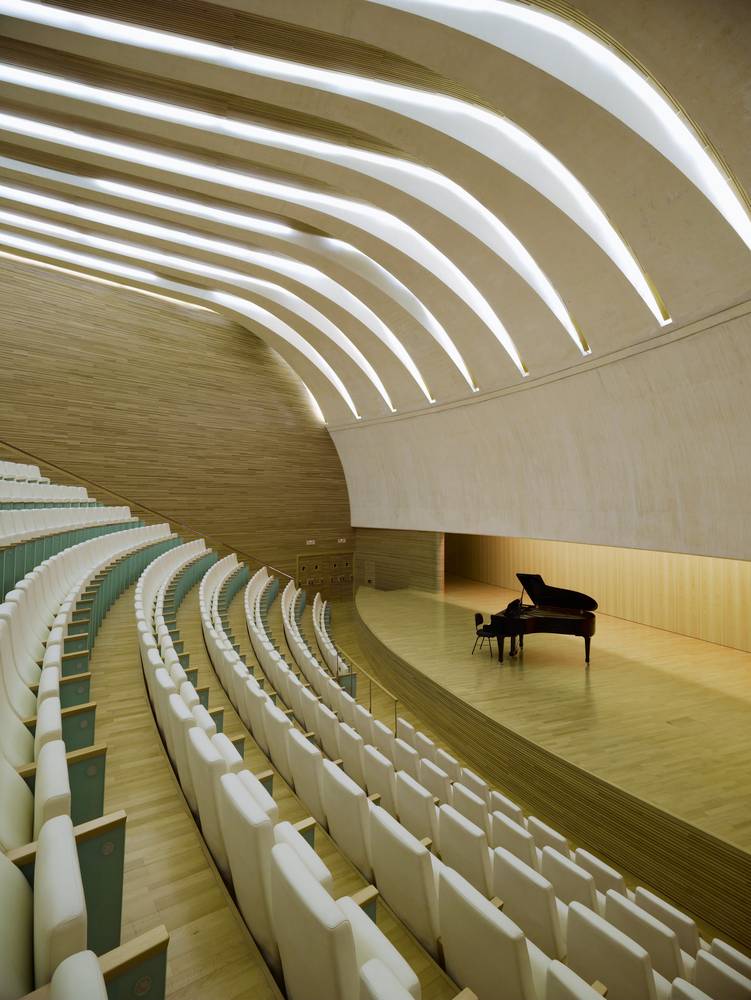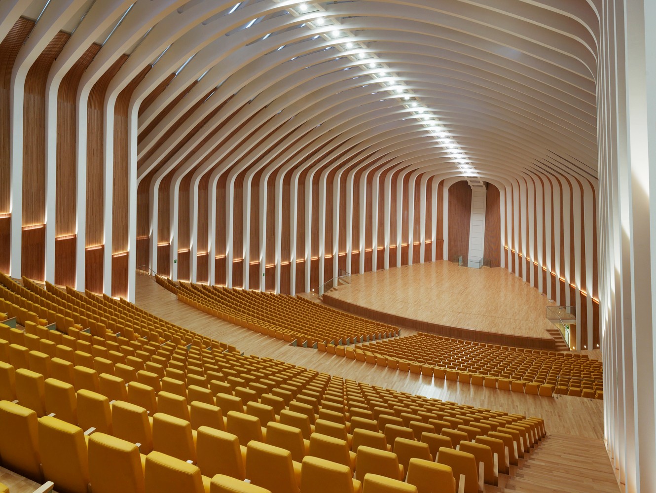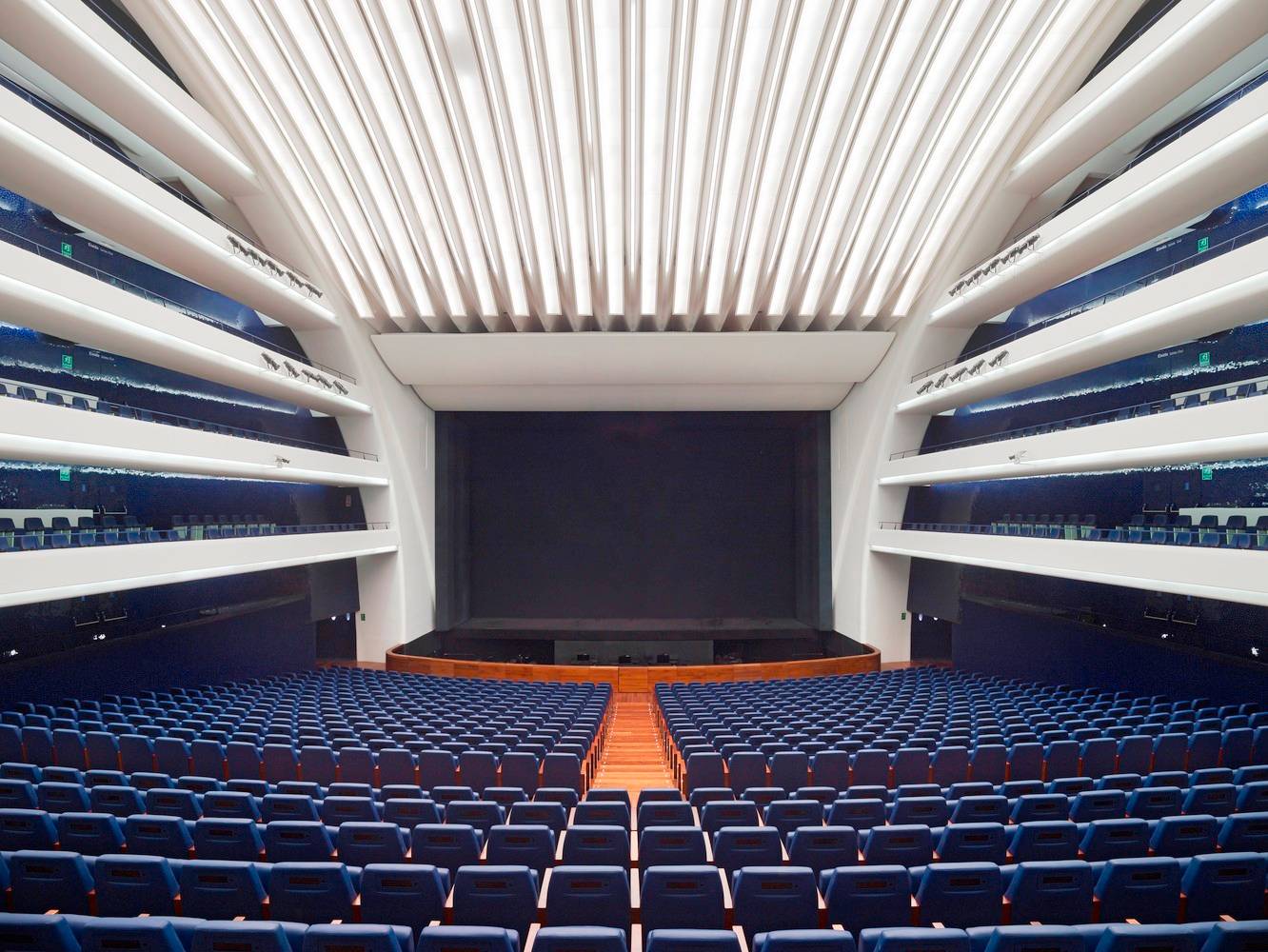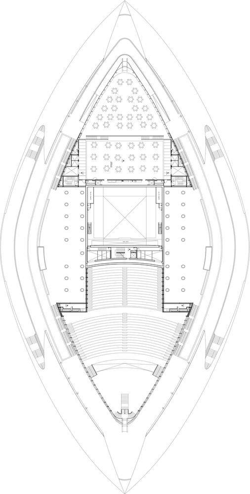 建筑物的不同體量堆疊在水平長廊甲板之間,懸臂延伸至結構的側面。建筑的中央核心由主禮堂的全空調(diào)系統(tǒng)的主禮堂占據(jù),主禮堂設在嵌入集群內(nèi)的聲學形狀的外殼內(nèi)。主要觀眾席的景觀模塊和升降機構也位于中央核心,其舞臺面積為5,166平方英尺。對于開放性能區(qū)域,圍繞復合體的屋頂和限定墻具有聲學功能,而在室內(nèi)音樂廳上方提供玻璃覆蓋的完美隔音排練區(qū)域。