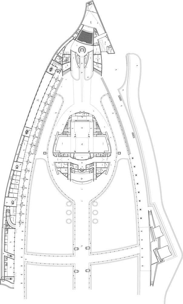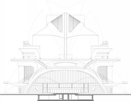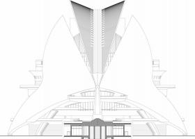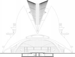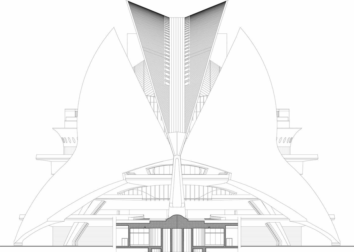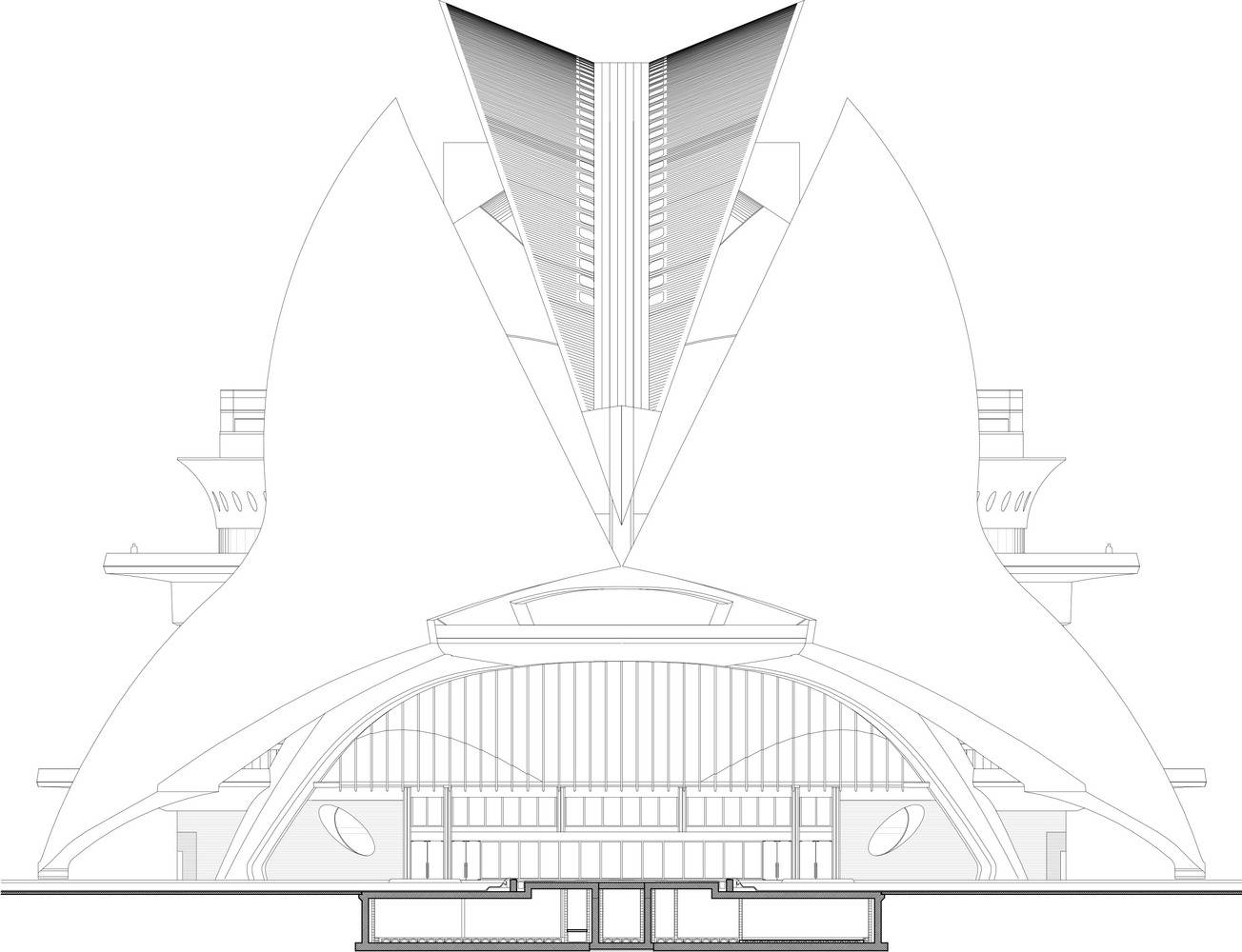 為了彰顯歌劇院在市民的重要性,卡拉特拉瓦為這座建筑賦予了極具紀念性雕塑意義的建筑形式特征。在建筑形式方面上來看,是一系列明顯隨意的體量組合,通過它們的外部殼體在兩個對稱的切割混凝土外殼上融合統(tǒng)一。這些形狀由一個鋼護套加冕在建筑的冠部,鋼護套從入口大廳軸向伸出曲線外殼的最上面的輪廓。結構定義了歌劇院的特征,大大增強了其在景觀中的象征寓意和一定的動態(tài)美感效果,同時為下面的平臺和設施提供保護和遮陽。