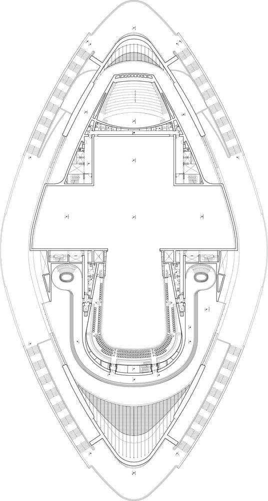 該建筑物周圍的外殼結構能夠使外部空間景觀滲透至不同的禮堂,花園露臺,自助餐廳和餐廳。這些區(qū)域由長廊陽臺,樓梯和室外的外部電梯相連,享有一級的城市和花園的美景。因為只有在進入禮堂時才需要購入門票,公眾市民無需買票的情況下仍然可以在整個建筑物內(nèi)自由游覽探索,通過這些使歌劇院能夠成為一個歡迎的城市角色作為聚會場所,并使人們更容易獲得音樂的感染和熏陶。