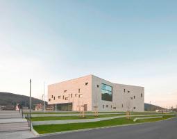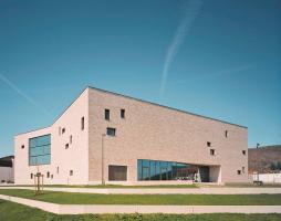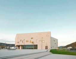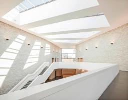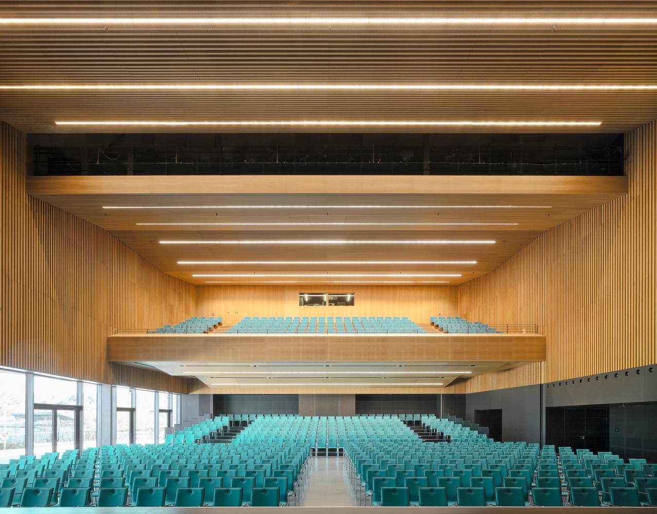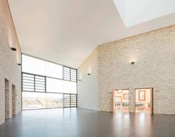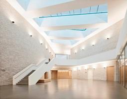門(mén)廳部分兩層通高,其寬敞開(kāi)放的空間歡迎著各方友人,并引導(dǎo)其直接通向后面的禮堂。禮堂內(nèi)有大約800個(gè)座位和大量的舞臺(tái)設(shè)備。餐廳的設(shè)計(jì)比較獨(dú)特,它通過(guò)一個(gè)可變的餐飲區(qū)同時(shí)為禮堂和門(mén)廳提供服務(wù)。建筑的主體量形態(tài)巨大且沒(méi)有多余的孔隙,其內(nèi)部容納有多層使用空間,并在每層點(diǎn)綴有不同大小的玻璃窗,在內(nèi)部和外部之間創(chuàng)造了良好的對(duì)話關(guān)系。