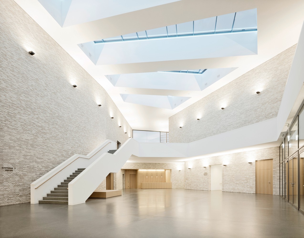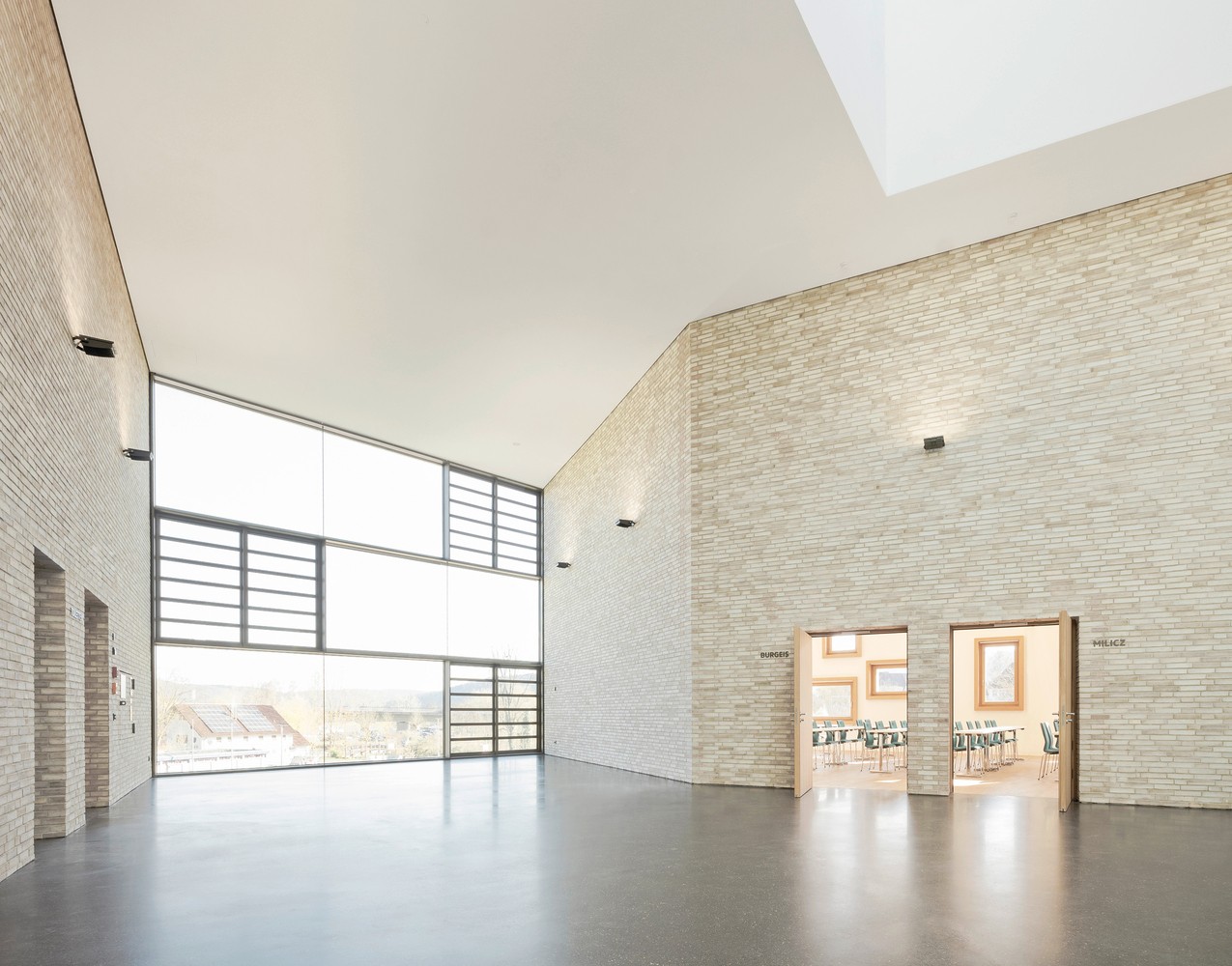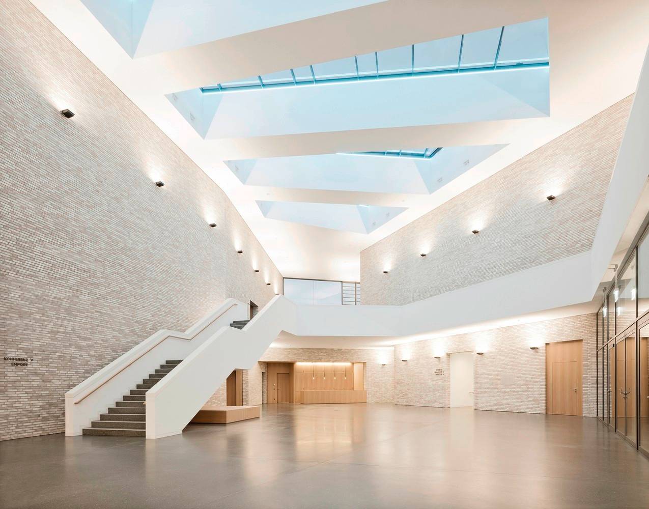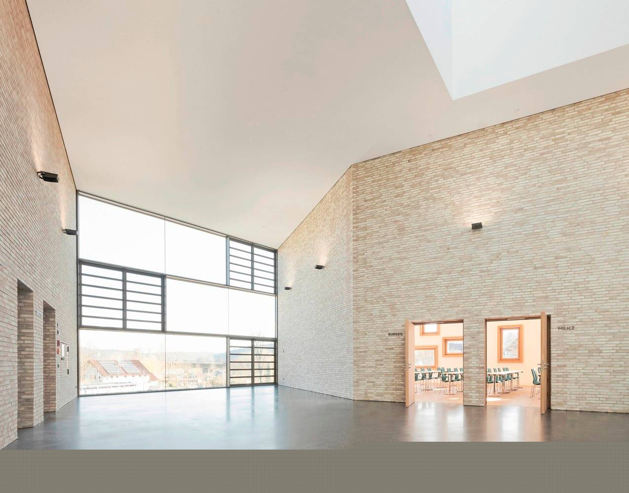 門(mén)廳連接著各種市政功能,一樓是大禮堂和小酒館,夾層是禮堂陽(yáng)臺(tái)的流通空間,同時(shí)也是多功能和研討會(huì)空間。分散的穿孔窗戶可以看到不同的外部景觀,它們的厚框架則是參照了沙龍中懸掛風(fēng)格的照片框。磚砌立面突出了建筑的雕塑形式,同時(shí)通過(guò)其外部和內(nèi)部功能使用形成了門(mén)廳空間概念的一個(gè)重要部分。