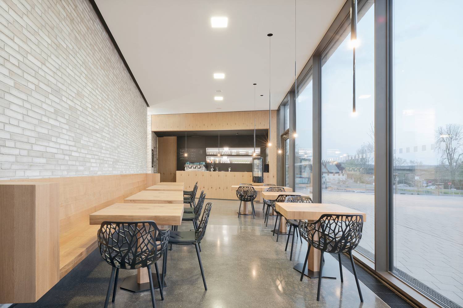 這在內(nèi)部和外部之間呈現(xiàn)出一種矛盾心理,還故意抹去了門(mén)檻。與此同時(shí),生動(dòng)有趣的結(jié)構(gòu)形式,手工鋪設(shè)的表面使得建筑非常人性化。內(nèi)部空間中精細(xì)雕琢的本地橡木通過(guò)其溫暖的色調(diào)呈現(xiàn)出一種特意的觸覺(jué)和視覺(jué)對(duì)比效果。這種天然材料既可以作為單板使用,也可以作為實(shí)木家具,還能用作聲學(xué)鑲板,這種多方面的用途使得其在建筑內(nèi)部燁燁生輝。