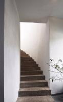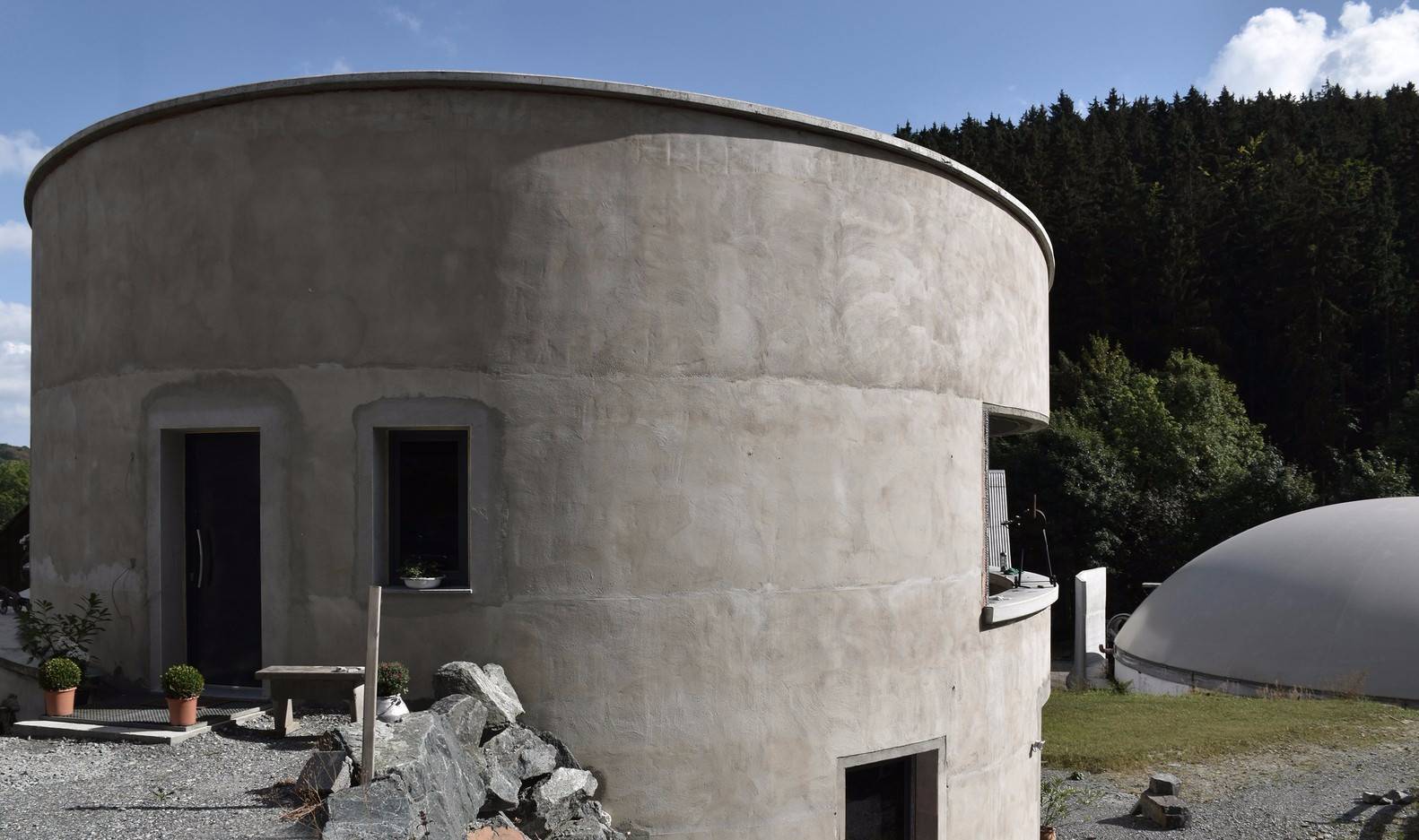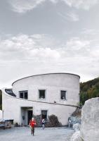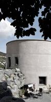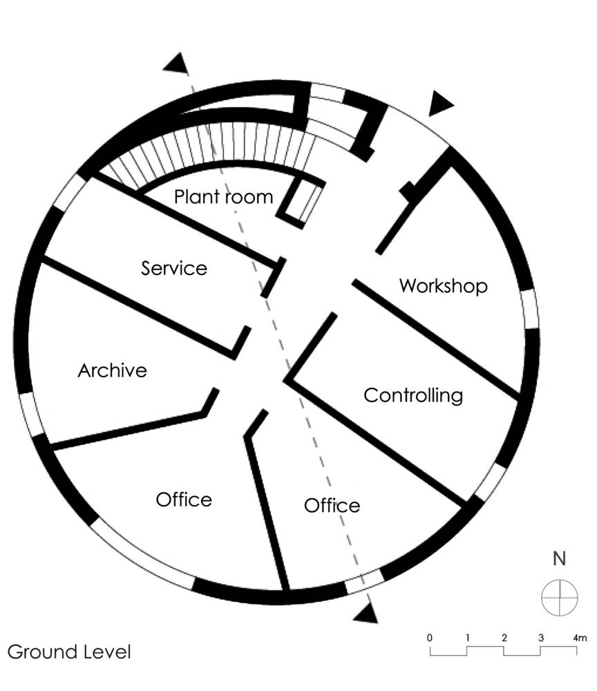 由此,建筑呈現(xiàn)為兩層的圓柱體。首層是辦公室和用于沼氣生產(chǎn)的技術(shù)房間,以閣樓的角度來看應(yīng)該稱為頂層的是生活空間。場(chǎng)地的特性,尤其是群山的斜坡,反映在屋頂?shù)男问缴?。除此之外,建筑所在區(qū)域的景觀通過涼廊和陽(yáng)臺(tái)就好像畫在建筑內(nèi)部似的。