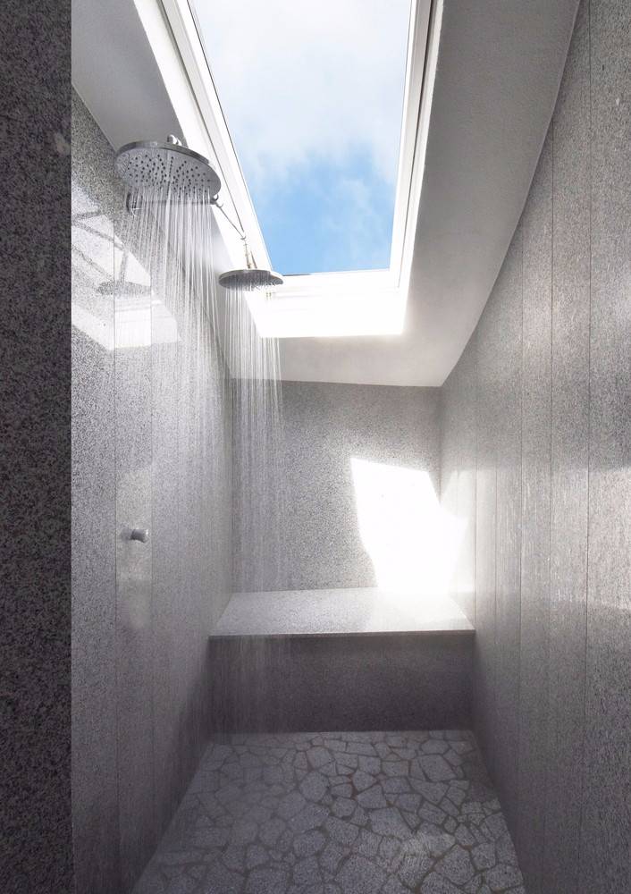 在上層的涼廊上,放置了一個(gè)由沼氣設(shè)備的廢棄物能源加熱的橢圓形浴缸,能夠欣賞到室外的風(fēng)景。
