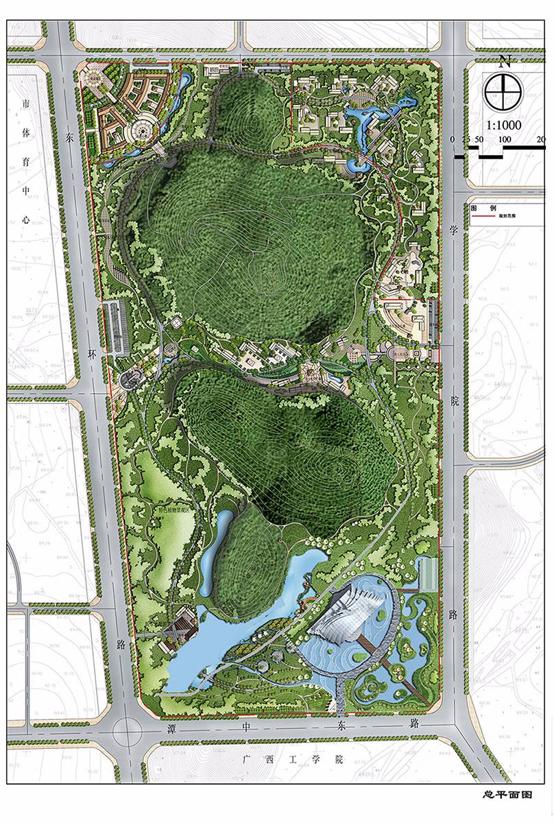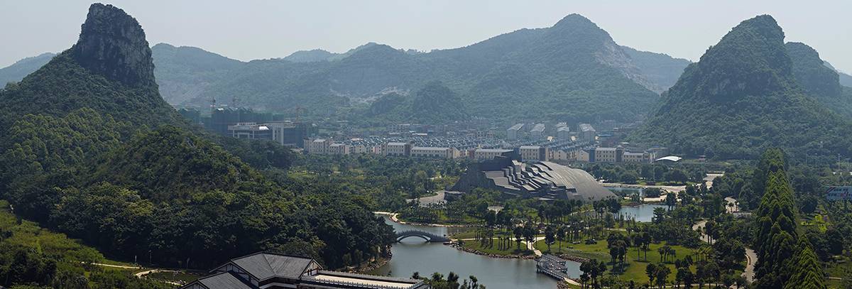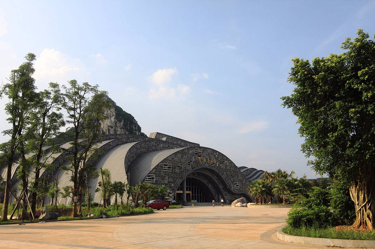 柳州是一座美麗的千年古城,碧玉般的柳江在廣西喀斯特大地上沖刷出一塊幾十平方公里舟狀島嶼,島內(nèi)外奇峰兀起,景色絕佳。奇石展覽館選址馬鹿山公園東南角,背依山巒,前景開闊。園內(nèi)有兩座遙相呼應(yīng)高百余米的奇峰,當(dāng)?shù)匕傩招蜗蟮貙⒏哒吆魹楣R鹿山和矮者母馬鹿山,最為逗趣地是母馬鹿山西側(cè)還有一座低矮渾圓的小山包被順理成章地稱之為馬鹿蛋山。兩山一高聳一低矮,一陡峭一渾圓,依偎在一起奇趣天成,和諧共生又對比強烈,大自然鬼斧神工的杰作。