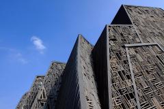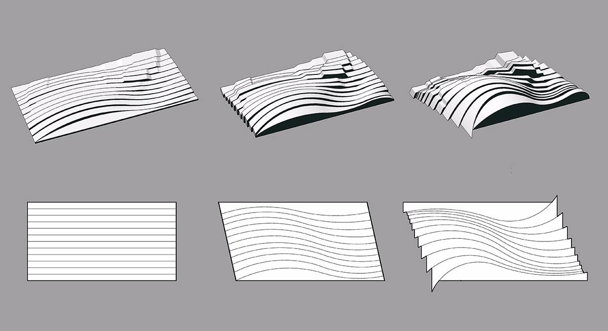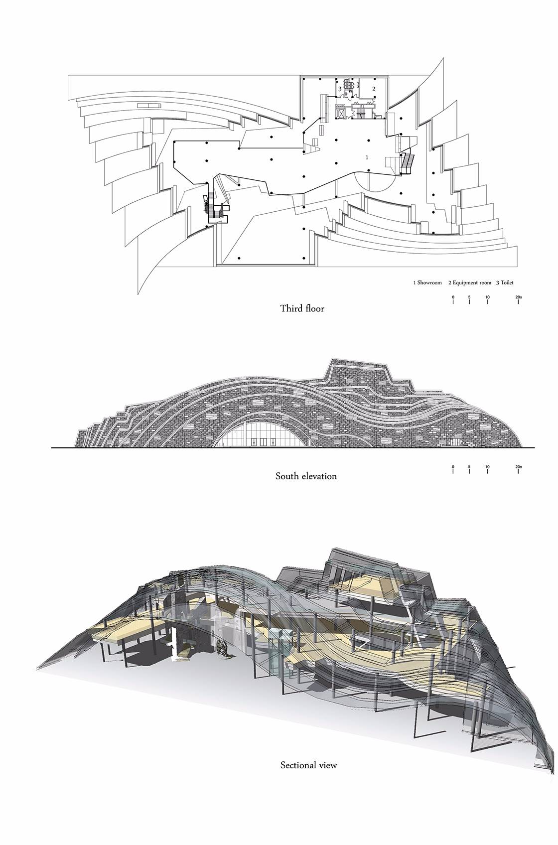 在建筑空間形體塑造上,將平面的矩形進行擠壓斜切成平行四邊形,在x與y的二維方向上運用拓撲學(xué)中的同胚變化原理將之分為十二份,同時這十二份之間帶有分形幾何的無規(guī)自相似的特點并兼具仿射自相似的特征,之后再把平面撕裂如同作地球的板塊運動。三維中的z軸變化開始進入其中。板塊本身作S形的高低變化,塊體之間呈有規(guī)律的相同變化,同時在兩個對立的方向上做相同又相反的自相似變化,板塊從東南一側(cè)起從曲到折,高度上從西南到東北由高至低作曲線變化。兩股反向的力各自推動一端向?qū)γ孀髦韵嗨品律渥兓?,相鄰的單元既相似又有各自的變化,隨著單元的增多,原有的特征變化慢慢消失而又不斷增加新的變化,一個不同以往的既矛盾又統(tǒng)一的新原型出現(xiàn)了。整個建筑體型呈現(xiàn)為前曲后折,山水一體的和諧變化。我們曾經(jīng)習(xí)以為常的方即是方,圓即是圓的慣性思維被顛覆,這個不方不圓的形體不合常理而合乎邏輯。曲線與直線不再以對比的,機械的,剛性的歐式幾何面孔出現(xiàn),而是從同胚、同倫到非同胚等一系列的拓撲變換下作非線性的變化。我將這種新概念的原型稱之為“流形”,一個從頭至尾充滿運動變化的并有兩個或多個不同表現(xiàn)形式端頭的形體,該形體表現(xiàn)的不是一個結(jié)果而是一個過程,一個包含有從線性到非線性變化的幾何構(gòu)成,兼具拓撲與分形的特征。