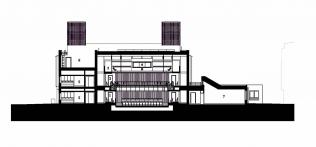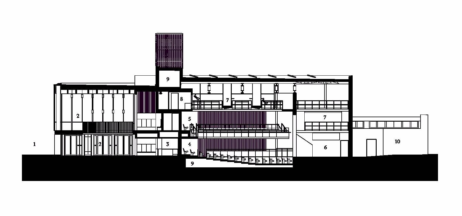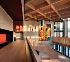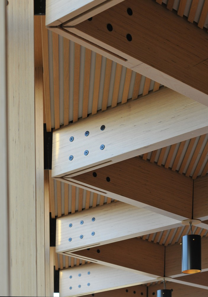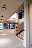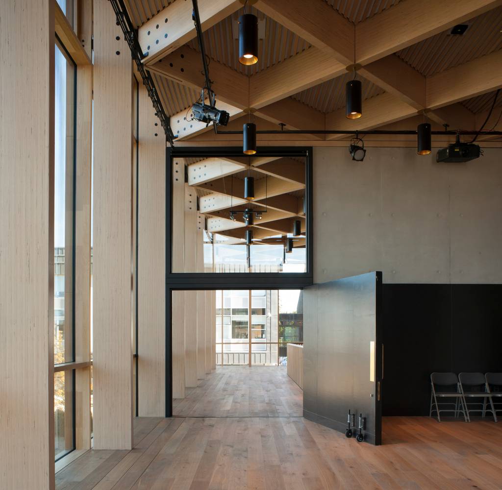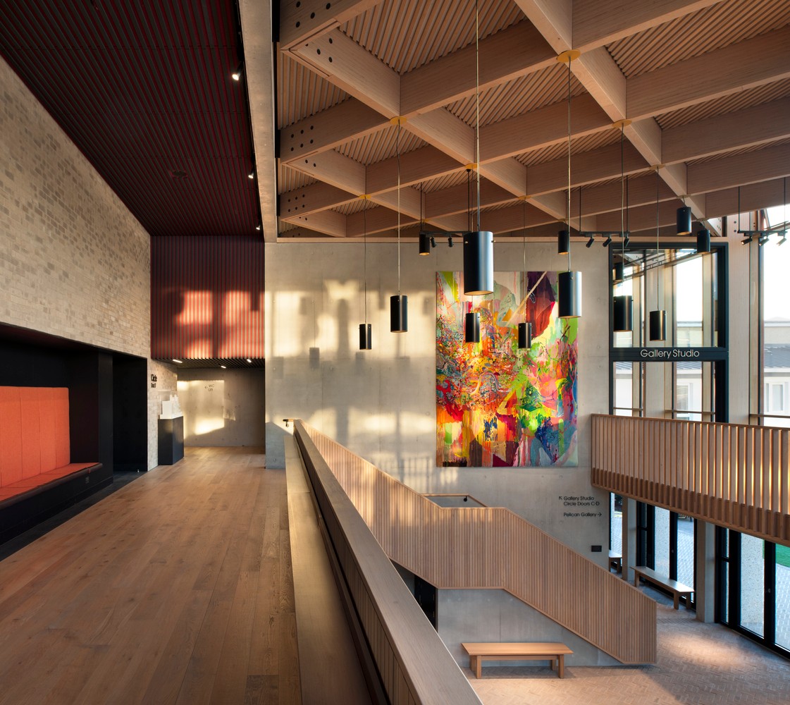 這個(gè)新的藝術(shù)中心包括一個(gè)400個(gè)座位的禮堂,一個(gè)適應(yīng)性的門(mén)廳空間,包括一個(gè)大型的日間排練和教學(xué)室,一個(gè)展覽空間和完整的后勤更衣室,車(chē)間和輔助空間,以及一系列的套件教室。三層高的帶有“斜紋”木質(zhì)屋頂結(jié)構(gòu)的畫(huà)廊門(mén)廳,自然采用日光照明,俯瞰著一個(gè)園景庭院,將成為學(xué)校的新中心區(qū)域。